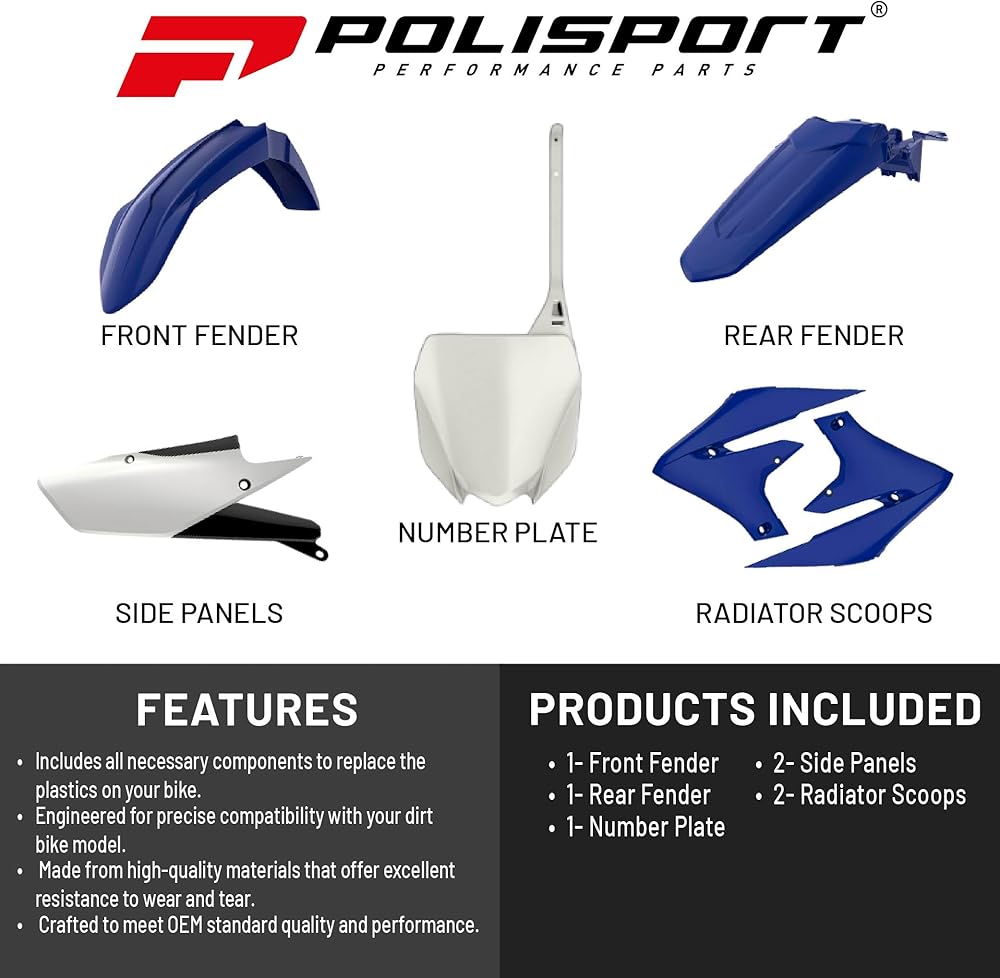 COMPOSITION: The kit consists of the following parts that can also be purchased separately; Front mudguard, rear fender, side cover, radiator cover and number plate
