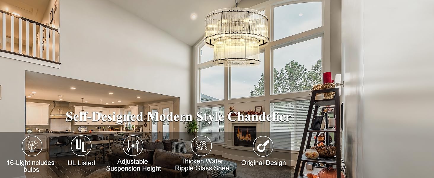 ETL-Certified & Complete Accessories: This ETL-certified chandelier guarantees safety and reliability. Includes 16 bulbs, spare crystals, and gloves for easy setup. The water ripple glass and matte black frame create a high-end focal point, our living room chandelier perfect for modern, transitional, or rustic interiors
