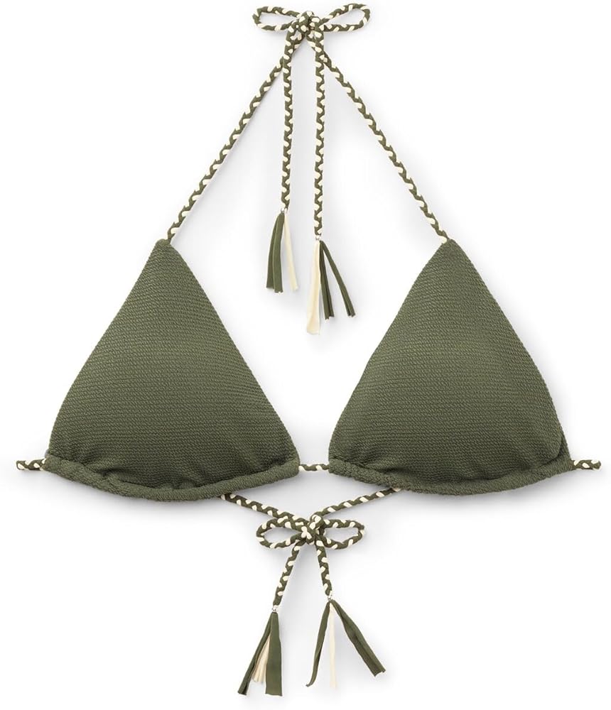 Slide triangle bikini top with removable padding, wireless for a natural effect. The 3D crinkled fabric, enriched by a braided string, provides a touch of sophisticated elegance. The shoulder straps have eyelets on the ends so they can be hooked onto the back band or tied behind the neck. Back string tie closure.