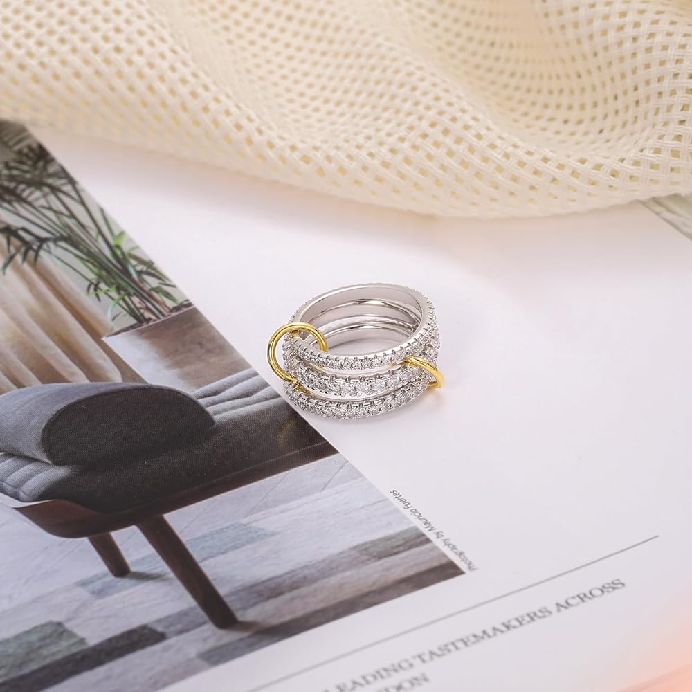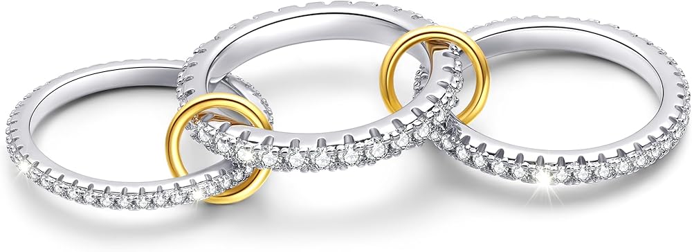 Elevate your style with this exquisite 3-piece stackable ring set, where timeless elegance meets modern craftsmanship. Each band is meticulously forged from 925 Sterling Silver, adorned with brilliant Cubic Zirconia stones. The delicate gold-plated connectors create a seamless flow, offering a customizable look—wear them together for a bold statement or separate for understated charm.