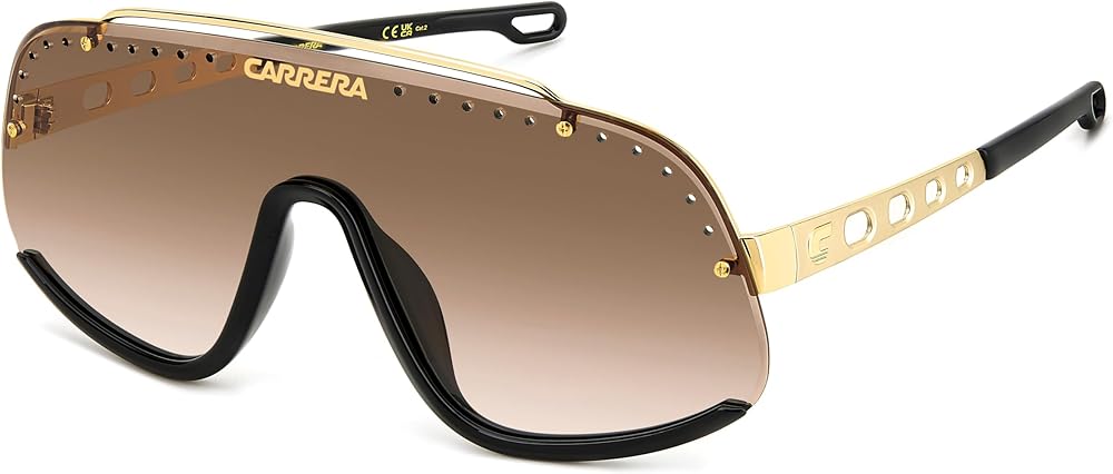 Bold signature Carrera logo on front with simple C-logo on temples