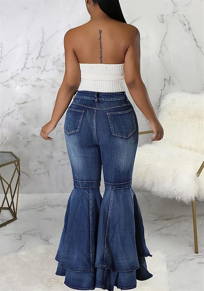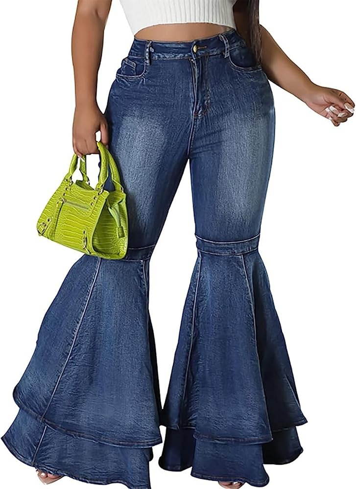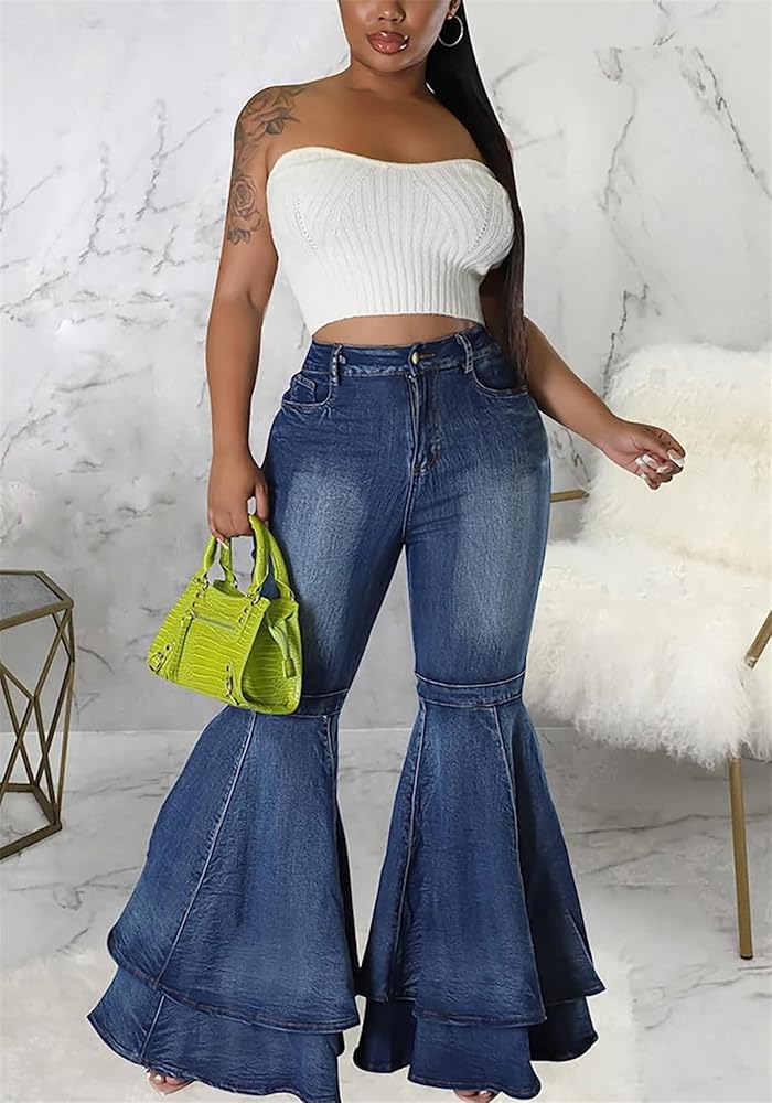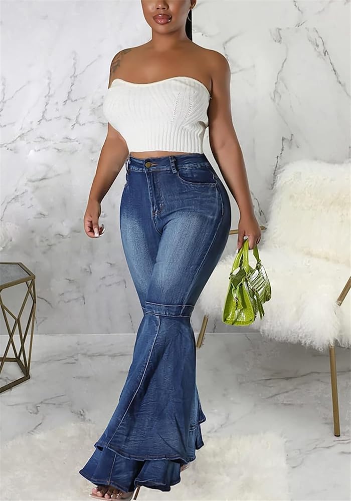 Material: Polyester Blend. This fabric is soft and skin-friendly, will give you a comfortable wearing experience.Cute flare jeans constructed from premium stretchy denim fabric, bodycon style to enhance the body's natural silhouette, while creating a slimmer, more streamlined look. Feature: Bell bottom jeans for women, skinny flare jeans, layered ruffle hem denim pants, bodycon long pants, patchwork pleated ruffle design. Casual denim jeans to highlight the leg line, elongated proportions and highlights your charming figure, while creating a slimmer, sexy elastic high waisted flare jeans for women. Collocation: Wide leg flare jeans with pockets to create casual style for your daily look. Bell bottom denim can pair it with a basic tee or button-up, sandals,and your favorite casual accessories, an essential for every fashion women or girl. Occasion: Fashion jeans women is suitable for daily day, relaxing at home, shopping, date, work, school, sports, going out, vacation, holiday etc. You can wear it in any season&occasion. Note: Our size is Smaller than the US size. Please refer to the detailed size measurement in image before order.(NOT AMAZON SIZE)