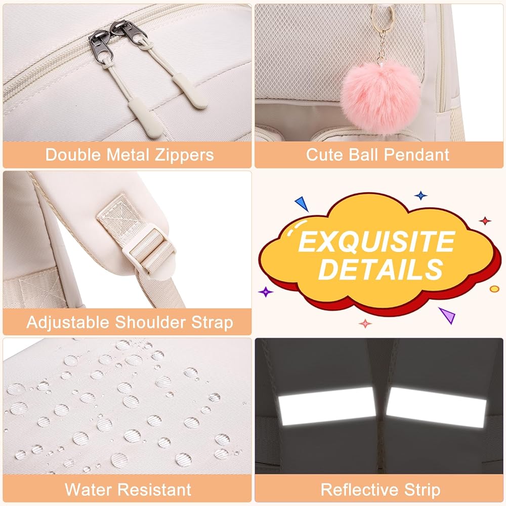 【Multi Pocket】: The backpack for school includes 1 main pocket, 2 small inner pockets (for storing small items), as well as a protective compartment for storing files or laptops, 4 external front pockets, 1 hidden zippered back pocket, and 2 side pockets for placing water bottles. This cute middle school girls' backpack features a multi compartment design and comes with a plush ball key pendant as a gift, adding practicality and fashion to it.