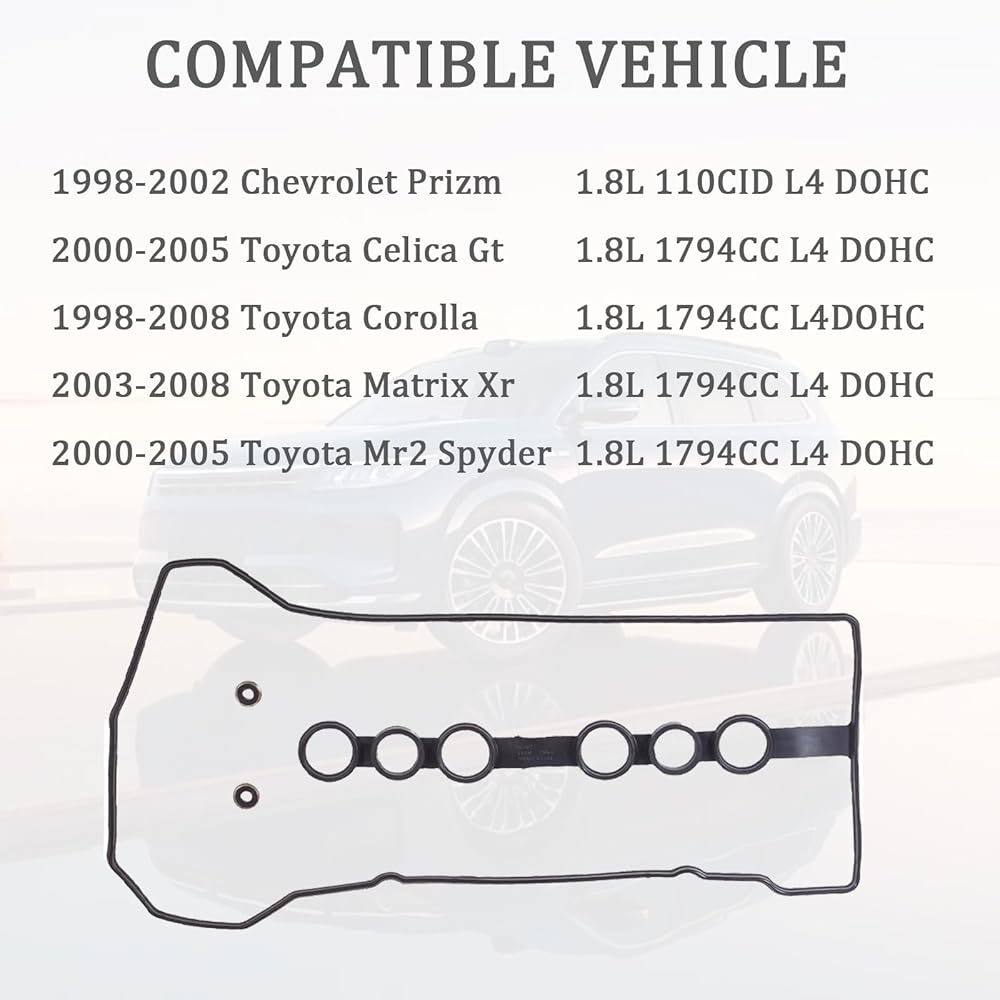【Compatiable】: Valve Cover Gasket Kit Compatiable with 1998-2002 Chevrolet Prizm 1.8L 110CID, 2000-2005 Toyota Celica Gt 1.8L 1794CC, 1998-2008 Toyota Corolla 1.8L, 2003-2008 Toyota Matrix Xr 1.8L, 2000-2005 Toyota Mr2 Spyder 1.8L, 1794CC L4 DOHC.
