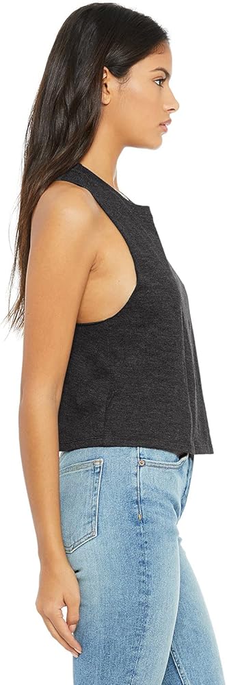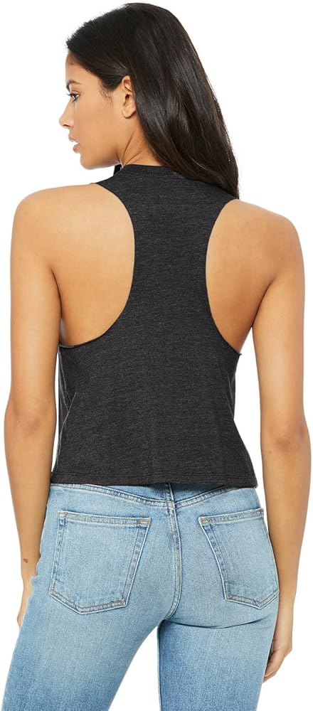 52% combed and ring spun cotton, 48% polyester; 32 singles; Raw armholes; Racerback; Cropped; Sideseamed; Tear away label