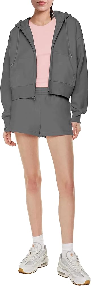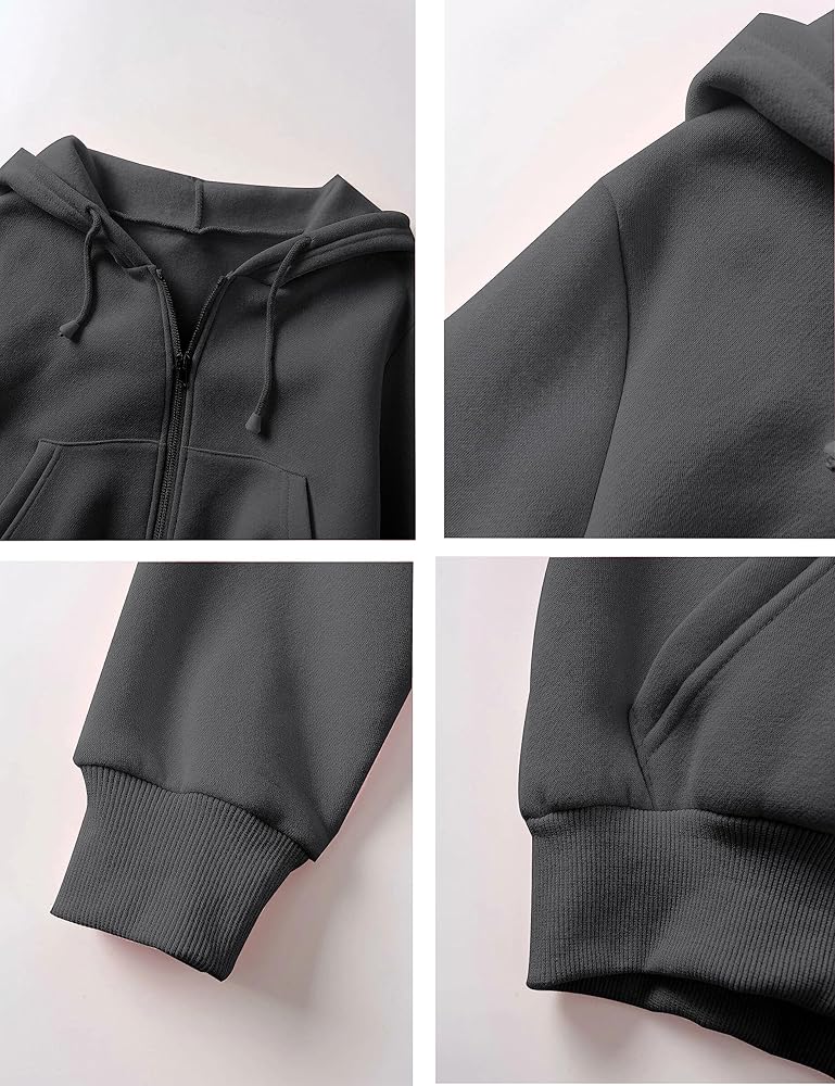 Elatsic rib cuffs and hem design,loose fit,stylish, long-sleeve full-zip short plush fleece lined sweatshirt with drawstrings hood