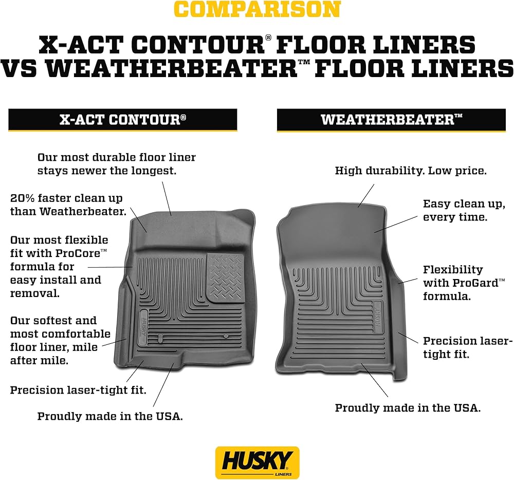 LASER-TIGHT FIT MEETS PROVEN DURABILITY The Weatherbeater combines a patented laser-tight fit with the proven durability that built the Husky reputation. It's protection for life, warrantied the same. The original all-weather liner is ready, come rain, snow or dropped coffee. The Weatherbeater's construction is a no-slip zone with zero edge curl, and its StayPut Nibs keep it firmly anchored underfoot. It stands up to the adventures of everyday life while staying tough and flexible, even under extreme temperatures. Its laser-scanned, FormFit Design gives your truck, van, or SUV an ultra-clean look with easy cleanup to match, while its patented, FormFit Edge keeps spills contained and carpets unstained. It's unbeatable Husky protection for life, warrantied the same. Proudly made in the USA.