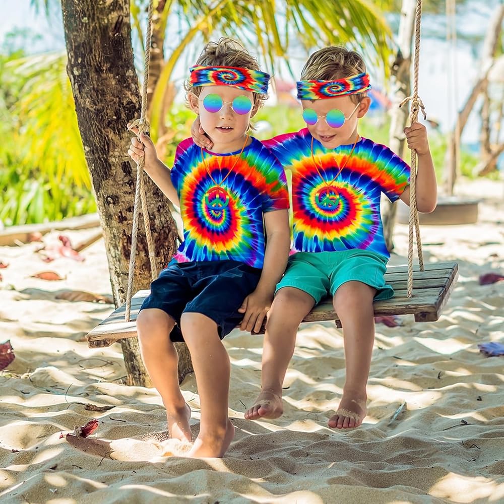 【Retro 70s outfits for kids】The kids hippie costume set includes 1 piece tie dye t-shirt, 1 pair of rainbow sunglasses, 1 piece hippie headband and 1 piece peace sign necklace. Get ready to turn heads with this far-out ensemble!