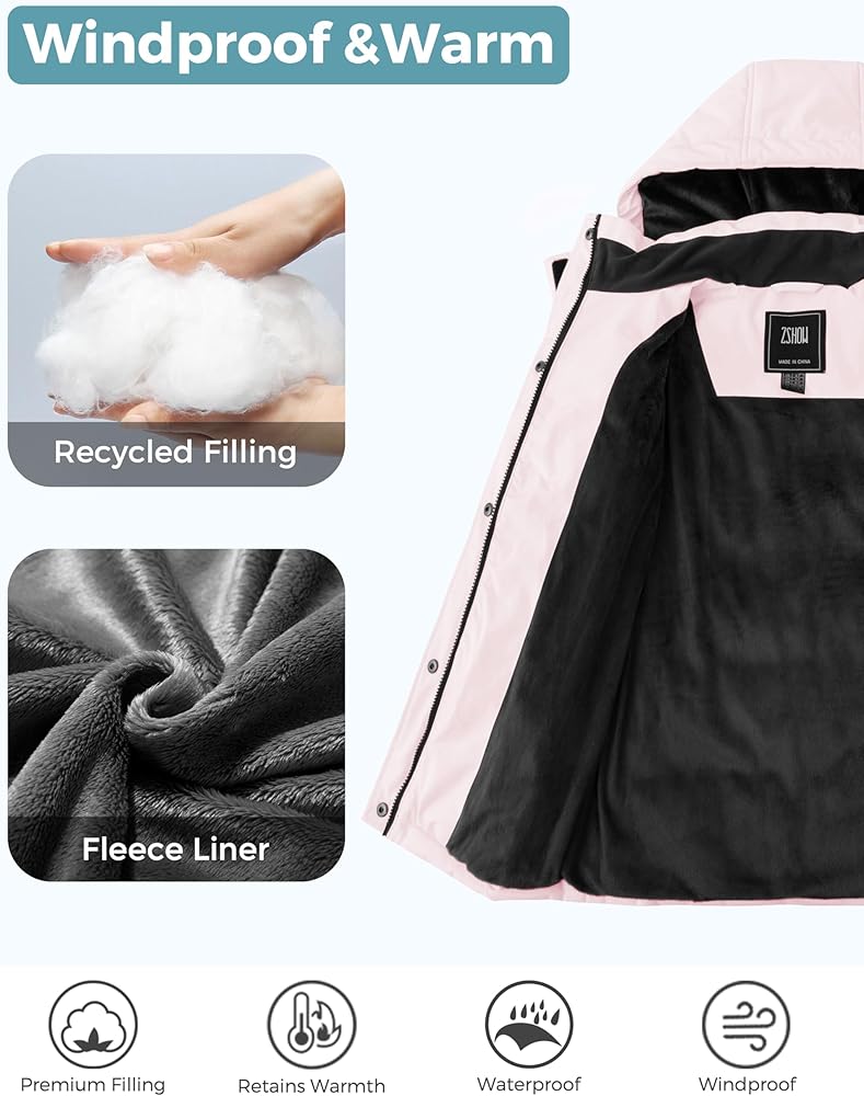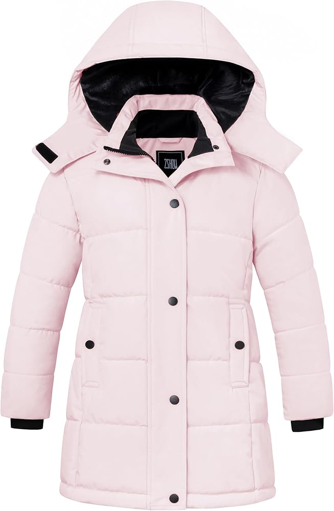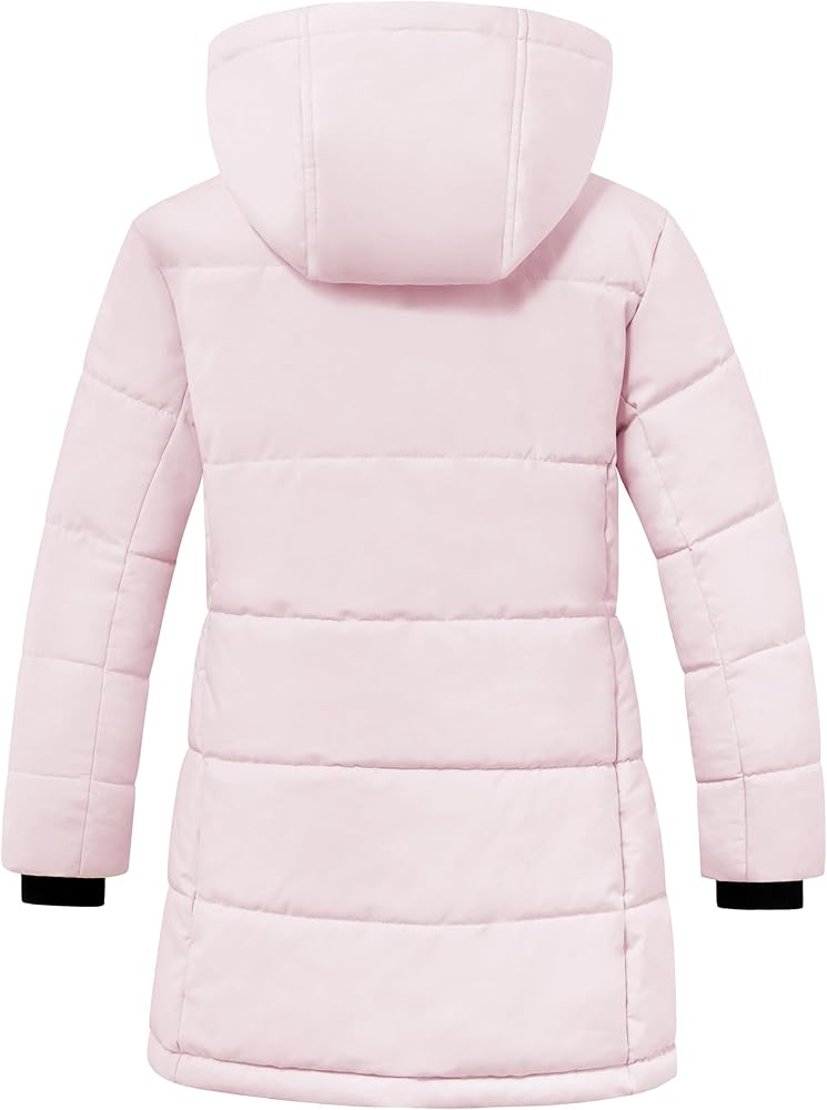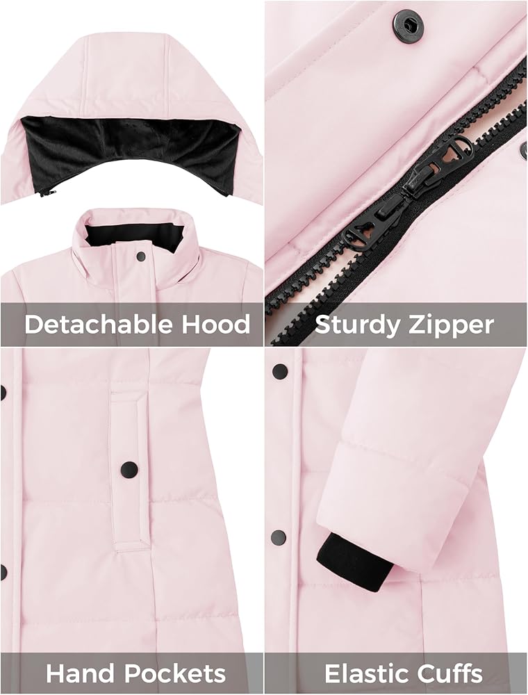 Windproof Winter Jackets for Girls - Icy air won't stop kids from enjoying outdoor activities. The kid's jacket is designed with a stand collar, detachable hood, and elastic ribbed cuffs, all the well-designs are effectively preventing wind intrusion and lock in heat, protecting kids' faces, ears, and neck from cold wind.
