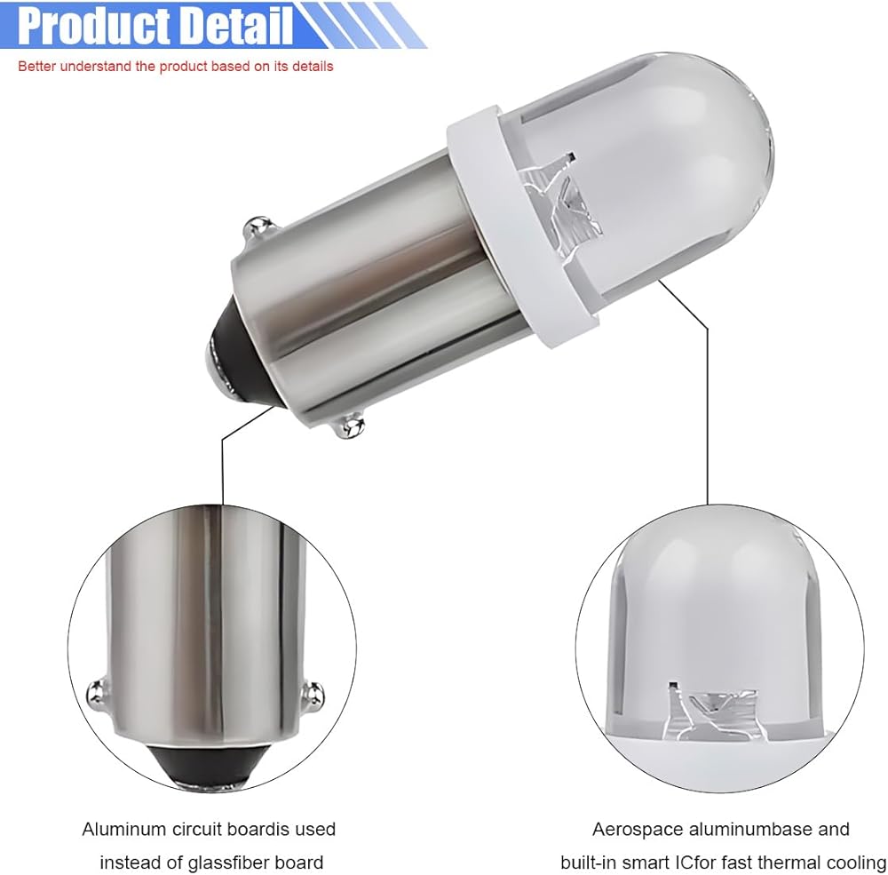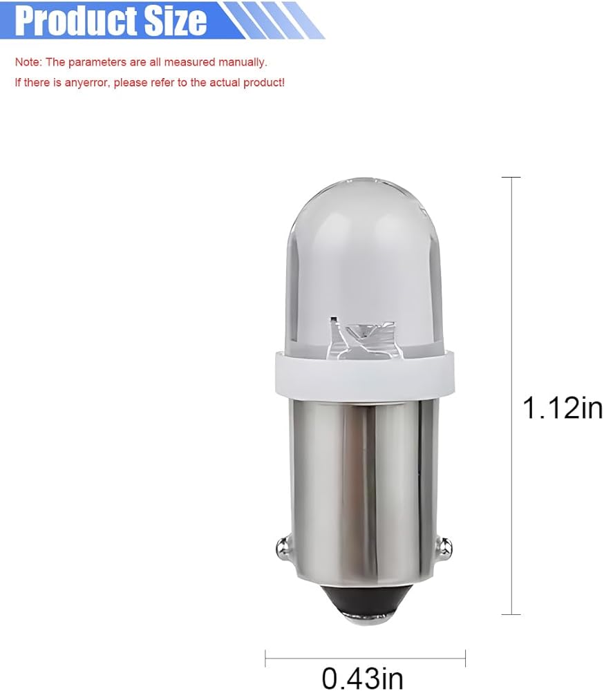 【Specification】:Car bulb size: 1.12×0.43 inches; Model: BA9S; Working voltage: 12V; Power: 0.5W low power consumption, color temperature: 6000K; Longer life.