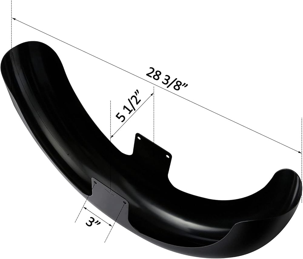 Fender Material: Iron. Fender Color: Painted Black. A width of 5 1/2" edge to edge at the fender mounting area; This fender has a Low Profile, oversized wrapped around design for 21" wheels