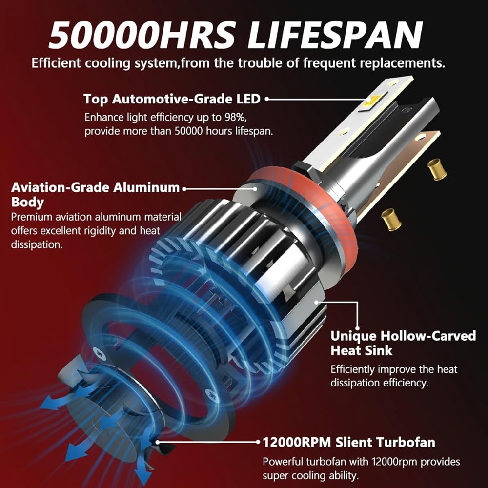 【More Than 50000 Hours】IHNZCB's headlight with the cooling system can keep the H9/H11 LED replacement bulb at a suitable working temperature all the time, built-in high-speed silent 12,000 RPM turbo fan and intelligent temperature control chip, the bulb body is made of 6063 aluminum alloy, which will not deform and corrode after long-term use, ensure the bulb lifespan can reach more than 50,000 hours.