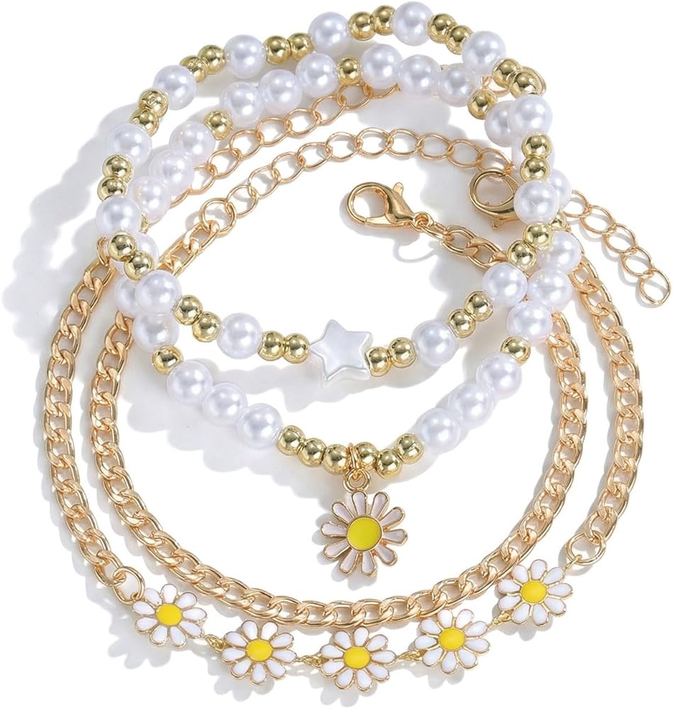 Daisy Bracelet Set: This multi-layered bracelet masterfully combines golden chains with pristine white pearls, adorned with daisy-like yellow blossoms.Every detail exudes a distinct sense of fashion and elegance, adding a touch of sweetness and freshness to the overall aesthetic.
