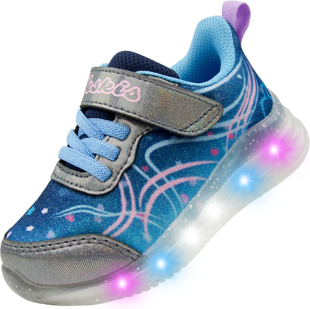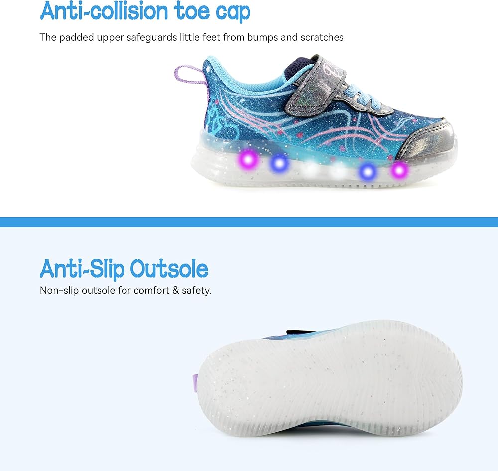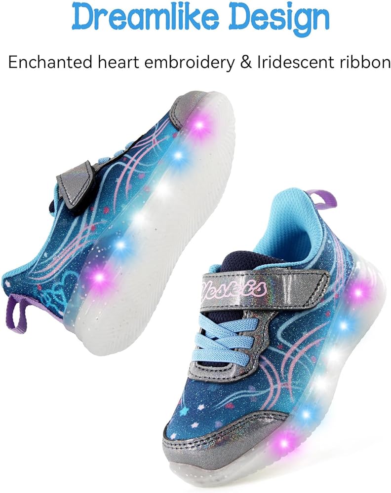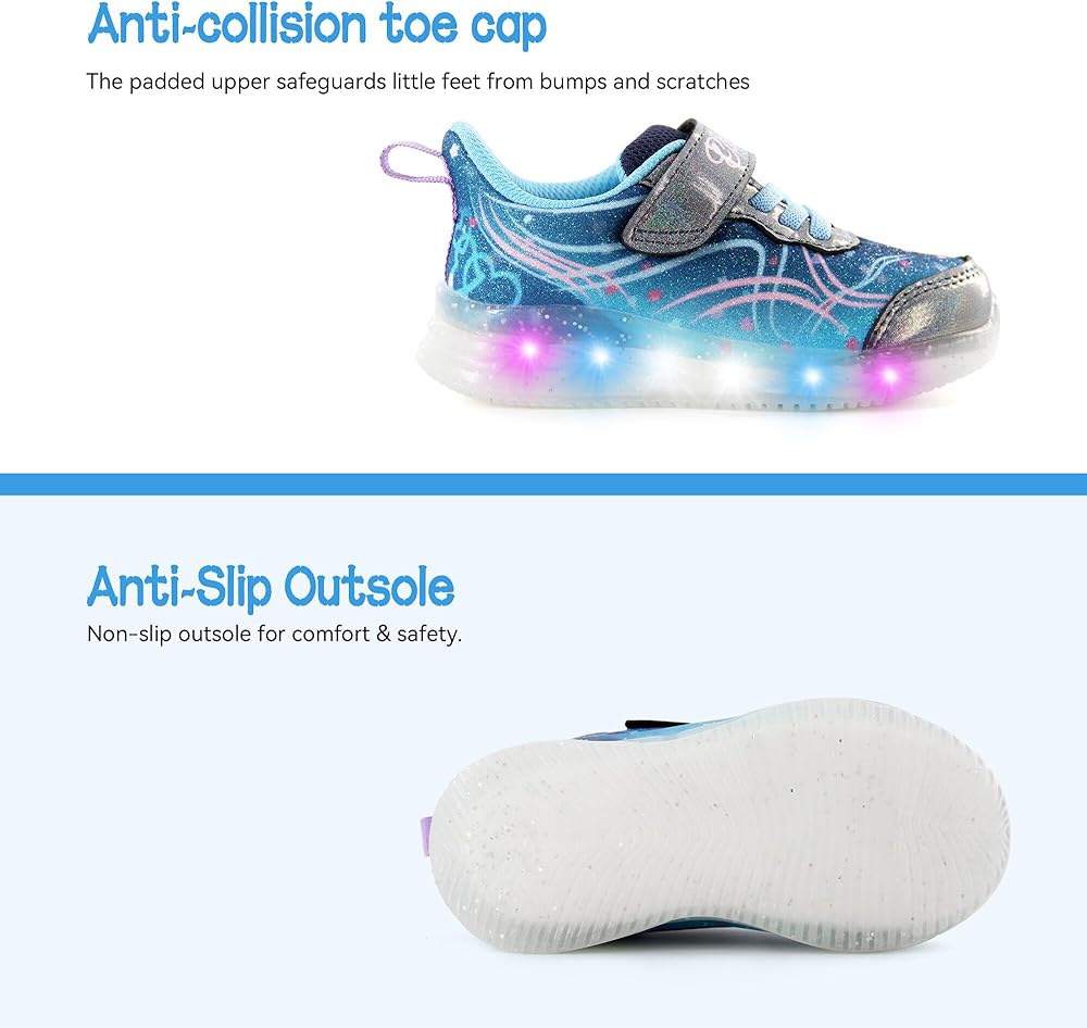 [Safe and Breathable Material]: Built for wild adventures! These girls toddler shoes with lights have non-slip treads for jungle gym climbs and reinforced toes to protect against scrapes. Toddler girls light up sneakers with breathable canvas and cloud soft lining let tiny feet sprint, hop, or explore sweat free.