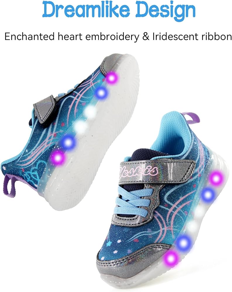 [Eye Catching Aesthetic]: Light up toddler shoes girl combines whimsical heart and ribbon designs with glowing reflective accents that catch headlights at dusk or dazzle during birthday parties. From dance class to school picnics, she'll steal the spotlight safely