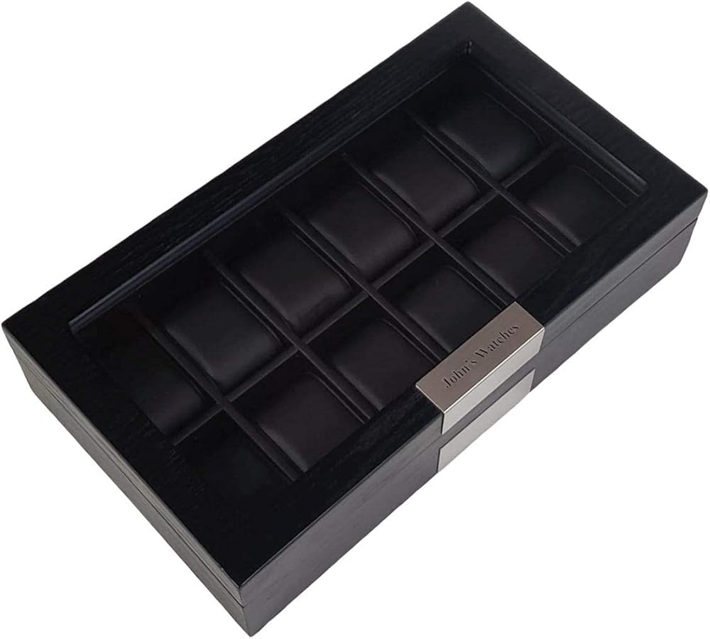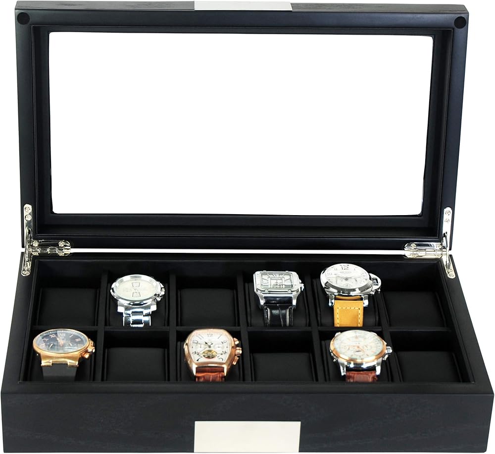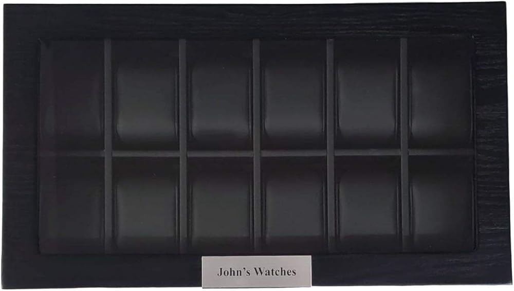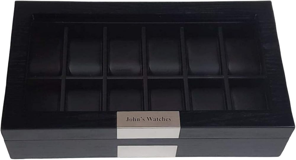 TIMELYBUYS Personalized 12 Black Wood Watch Box Display Case Storage Jewelry Organizer with Glass Top, Stainless Steel Accents, and Oversized Deluxe Pillows