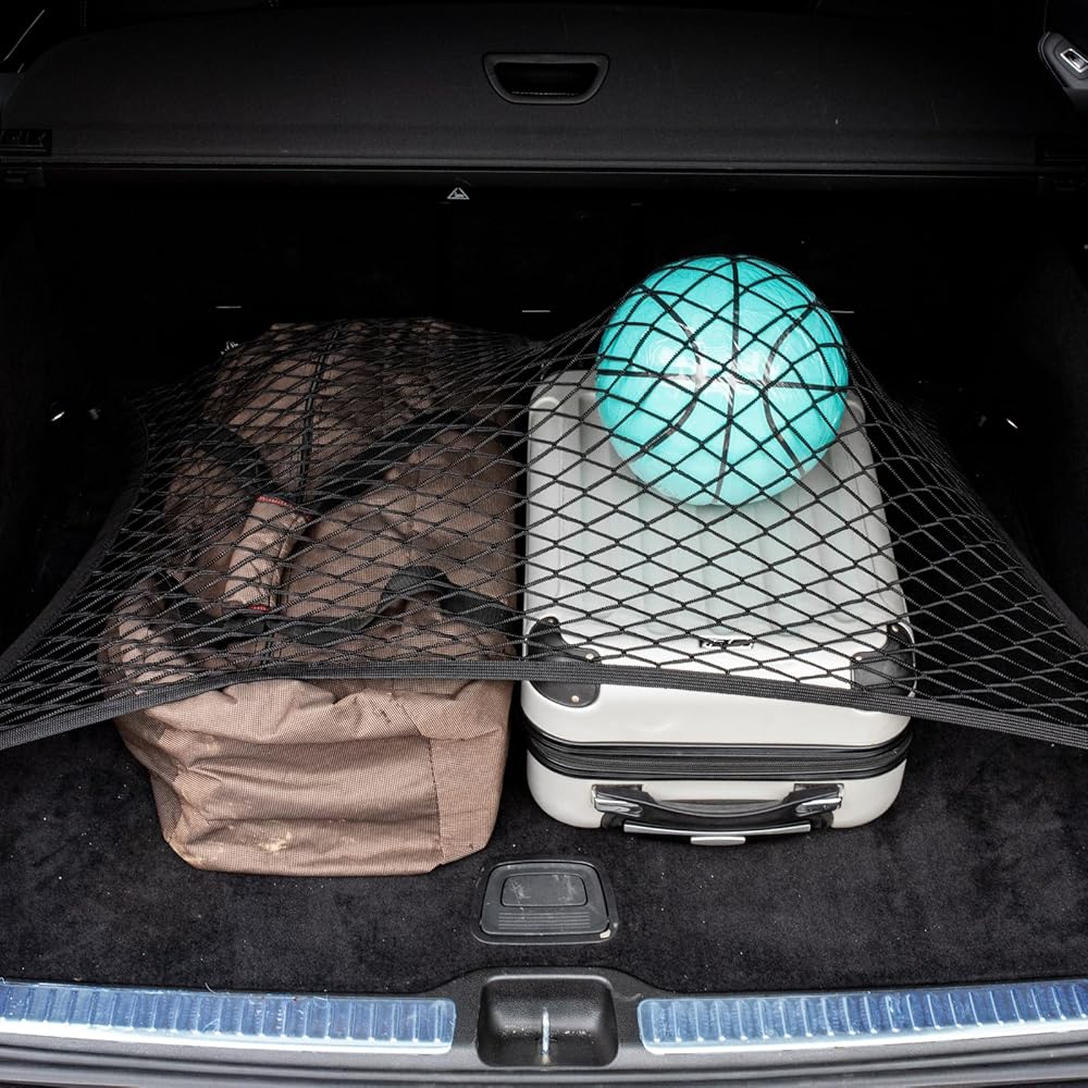 High-Elasticity Design: The elastic net has an original size of 27.5x19.6 inches and can be easily stretched to 49.2x43 inches, making it compatible with a wide range of vehicles, including sedans, SUVs, RVs, Jeeps, MPVs, vans, and off-road vehicles such as the Volkswagen Tiguan, Ford Kuga, Chevrolet Cruze, and Audi A4L. Whether for daily shopping or long-distance travel, it efficiently utilizes trunk space while keeping items secure and organized