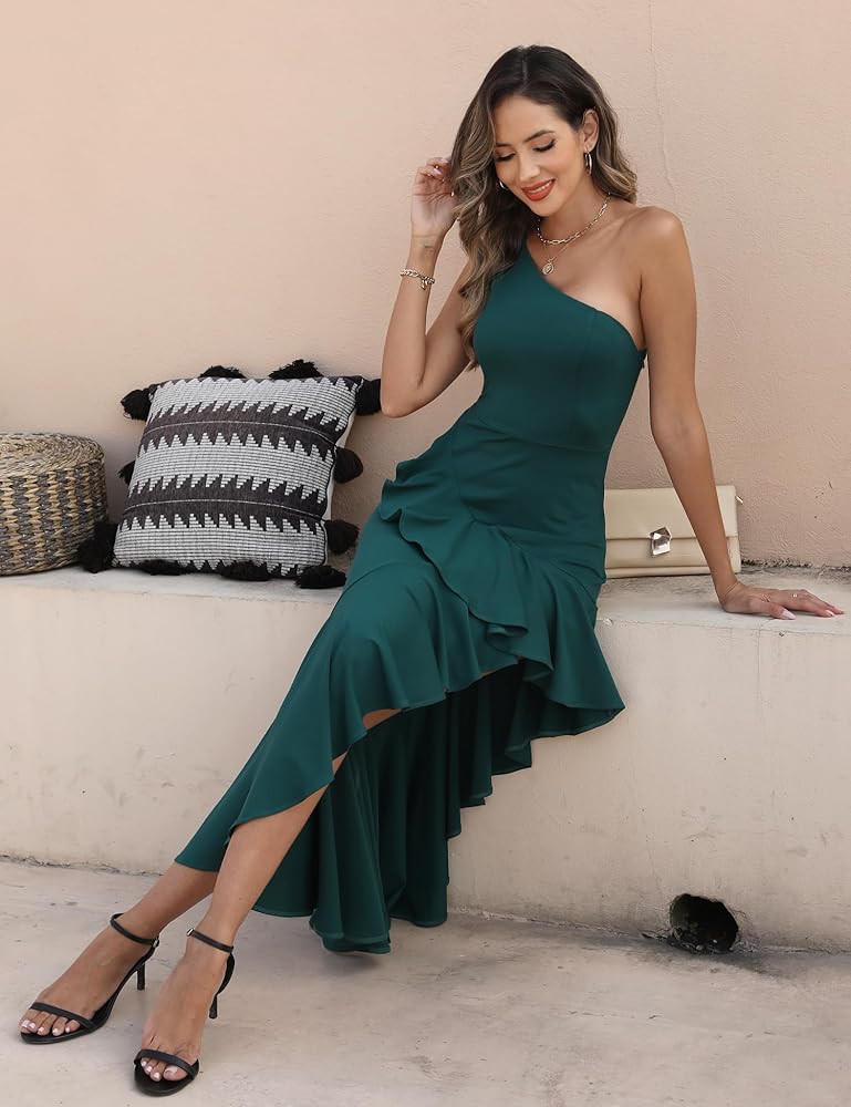 Features:Elegant one shoulder design, gorgeous ruffled hem, sleeveless design, asymmetrical hem, showcasing a noble and elegant temperament