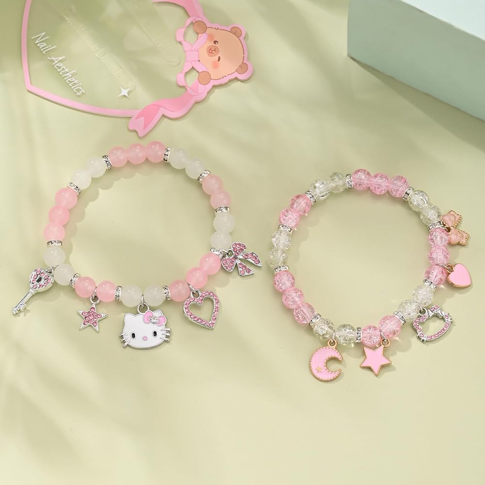 Kawaii Jewelry Set : This Jewelry Set Including 2pcs pink Bracelets ,with heart, bows, cat charm. Show cuteness and fashion