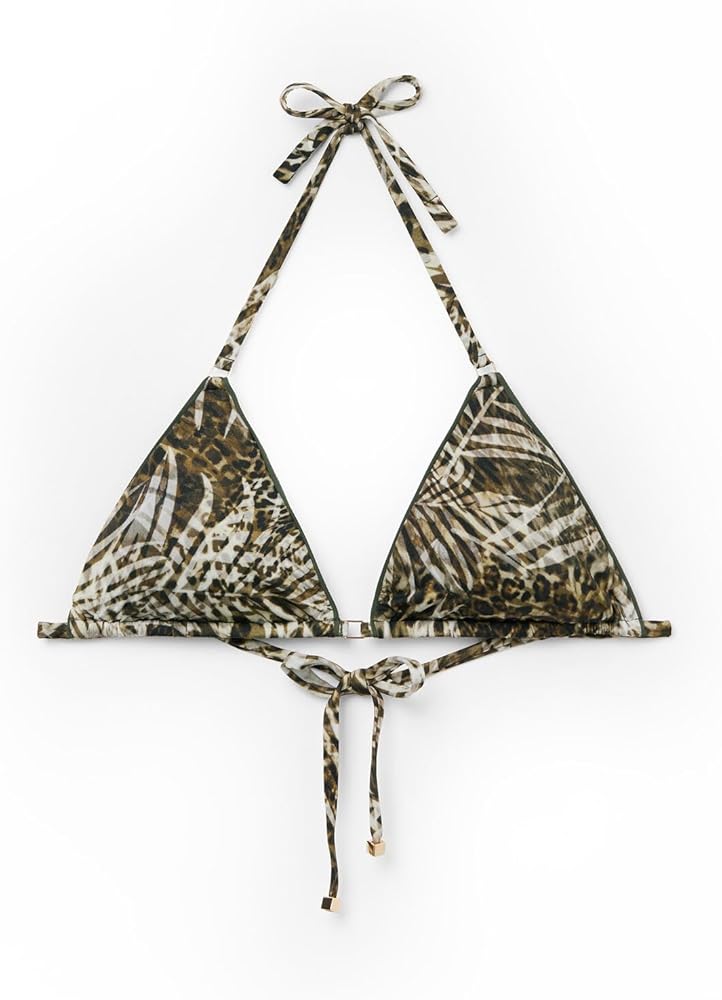 Slide triangle bikini top with removable padding, wireless for a natural effect. Reminiscent of animal print, the foliage pattern brings together exotic leaf designs with motifs that evoke markings from the animal world. The shoulder straps have eyelets on the ends so they can be hooked onto the back band or tied behind the neck. Back string tie closure.