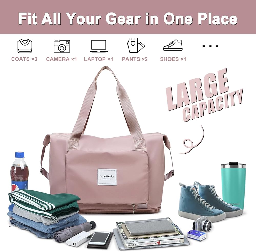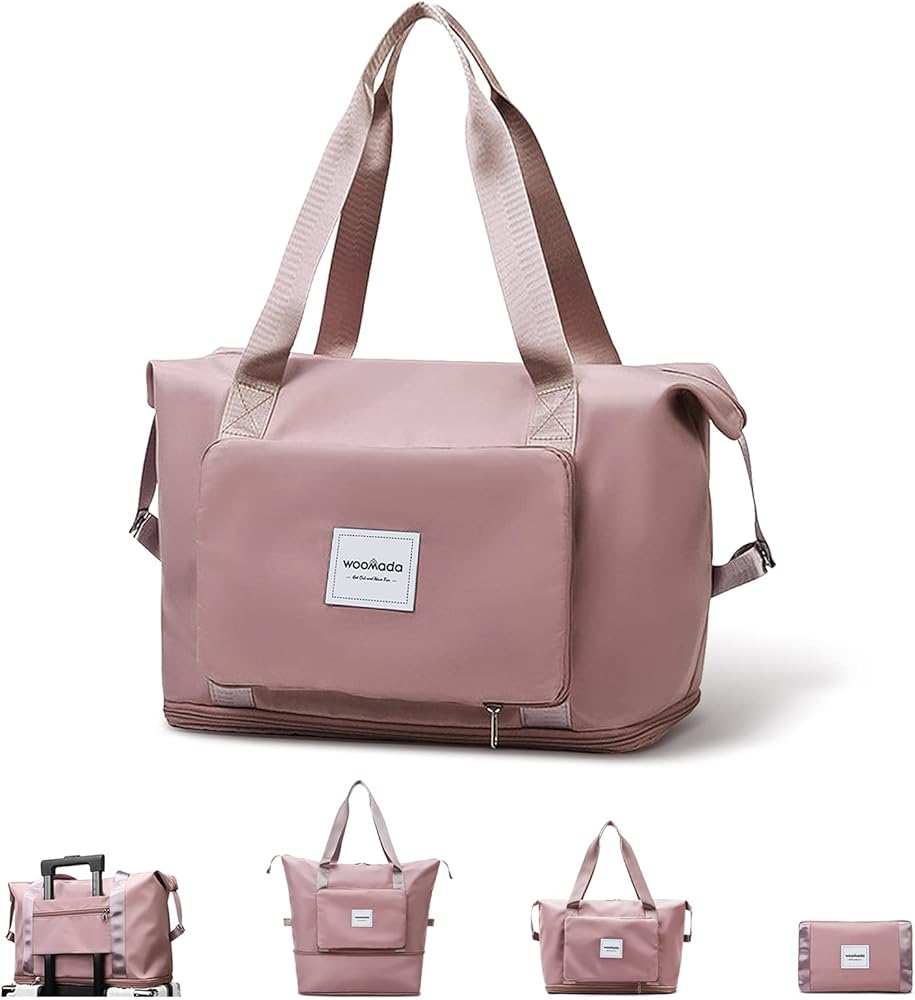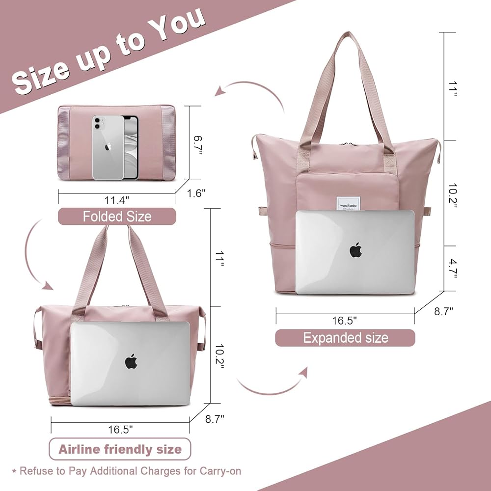 Multiple Sizes and Airline Friendly: WOOMADA large capacity travel bag can be folded from the bottom or expanded from the pouch according to your needs. Portable folded size: 11.4x1.6x6.7 inches ( fit into your suitcase or backpack); Airline friendly size: 16.5x8.7x10.2 inches (refuse extra charges); Travel large capacity size:16.5x8.7x15 inches (more space for travel )