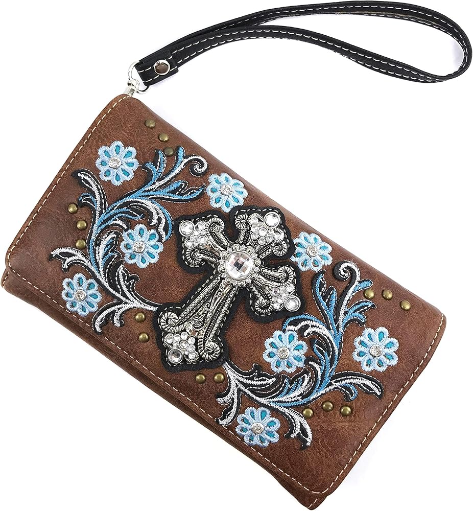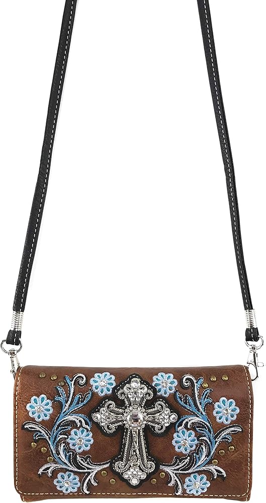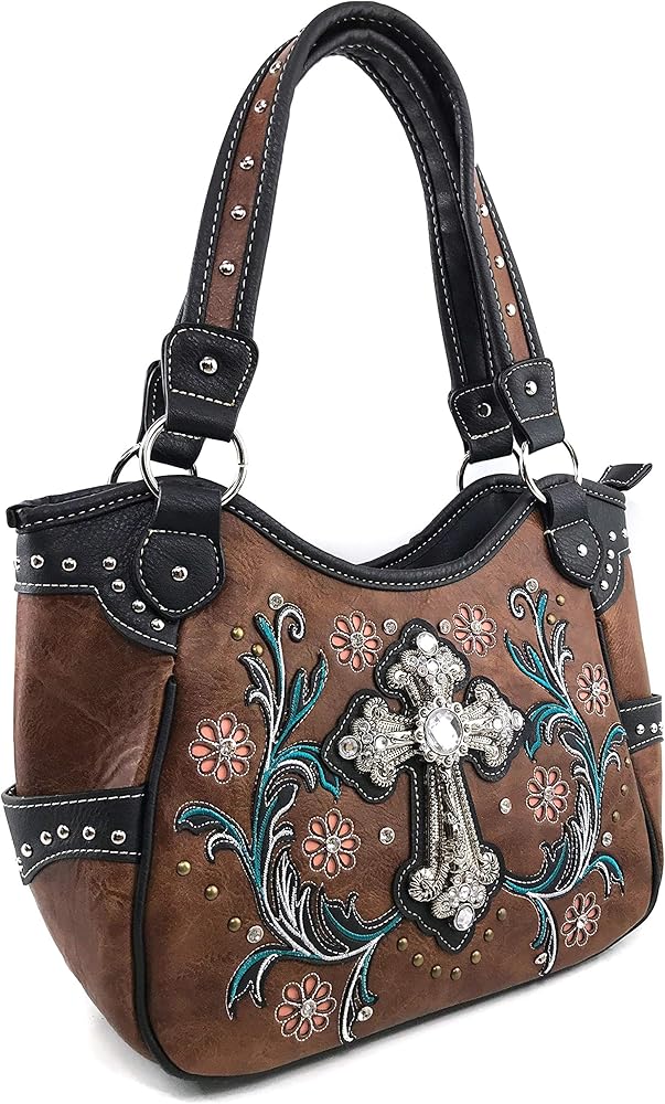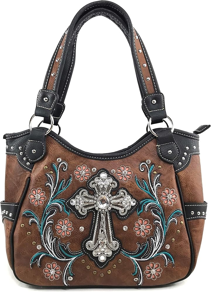 Rhinestone silver cross with western embroidered floral daisy flowers. Fine embroidered and laser cut design on pu leather. Beautiful western inspired floral cut design concealed carry tote purse. Finished with a classic western floral design and top zipper closure. Our tote purses are big, spacious, and beautiful. Large size and roomy interior to fit important your personal items. Top handle pu leather strap for comfortable carrying and rests well on your shoulders. Interior showcases a middle zipper divider pocket, open and closed zipper pockets for better organization of your belongings. Open side pockets for items that need quick retrieval. The back conceal carry pocket is large enough for popular handheld firearms like Glocks. Wide pocket on the back to fit your smartphone or handheld devices. Made from premium quality pu synthetic leather. Pu leather is leather made from inner splits of hide polished with polyurethane coating to deliver a more durable and sturdy purse. Fast priority shipping! Message us for any inquires and questions.