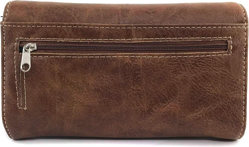 Wallet specs - Size: 7.5" x 4.5" x 1.5" | Trifold open style | 7.5" drop detachable wristlet strap and 24" drop detachable crossbody strap included | magnetic closure | Left Panel: two clear slip card holders and one slip checkbook/cash holder | Middle panel: one clear card holder, 5 card holders, 3 cash holder pockets, middle divider zipper pocket (coins) | Right Panel: 4 slip card pockets and one slip checkbook or cash pocket | Back zippered coin pouch