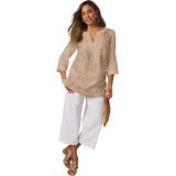 This timeless tunic silhouette gets an elegant upgrade with delicate embroidery on the front panel. Ease this customer-fave fabric over matching linen pants for an airy outfit that flatters from day to night. Relaxed silhouette Split V-neck placket Three-quarter straight sleeves Bust darts Straight hem with side slits 32” length Linen/rayon Machine washable Imported
