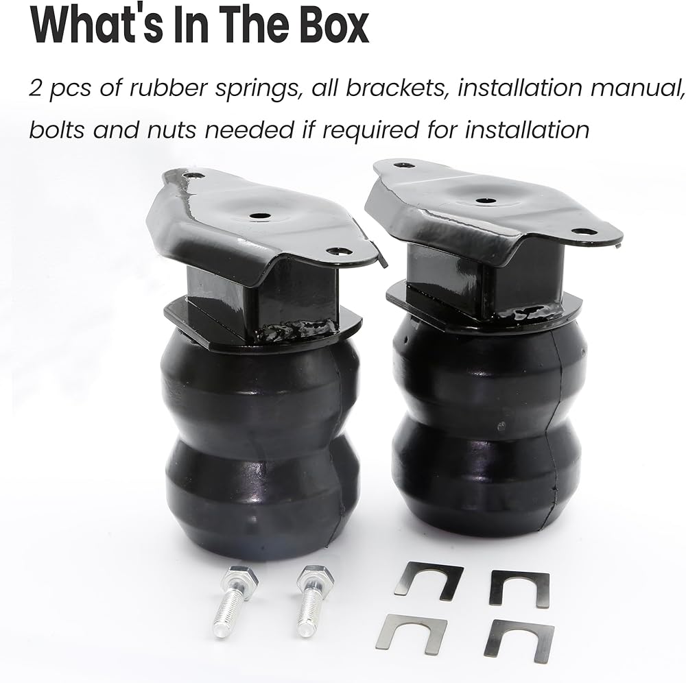 2 pcs of rubber springs, all brackets, installation manual, bolts and nuts needed if required for installation