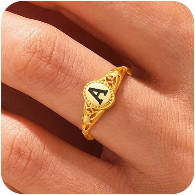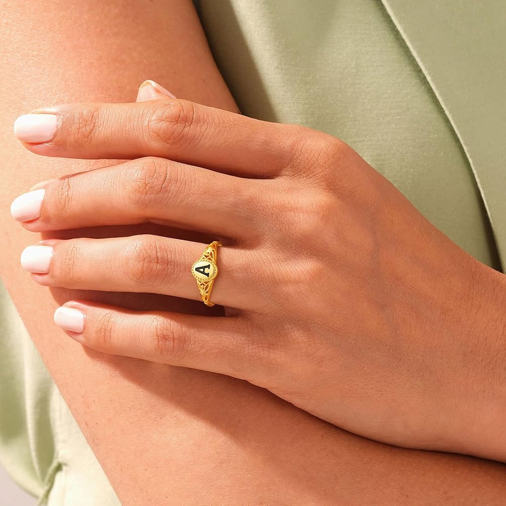 Gold Initial Rings for Women: The gold ring has 26 letters, and the retro design plus the black letters give you a different kind of charm when you wear it. You can wear it alone or stack it with other initial rings to match your favorite style. It is your must-have jewelry item.