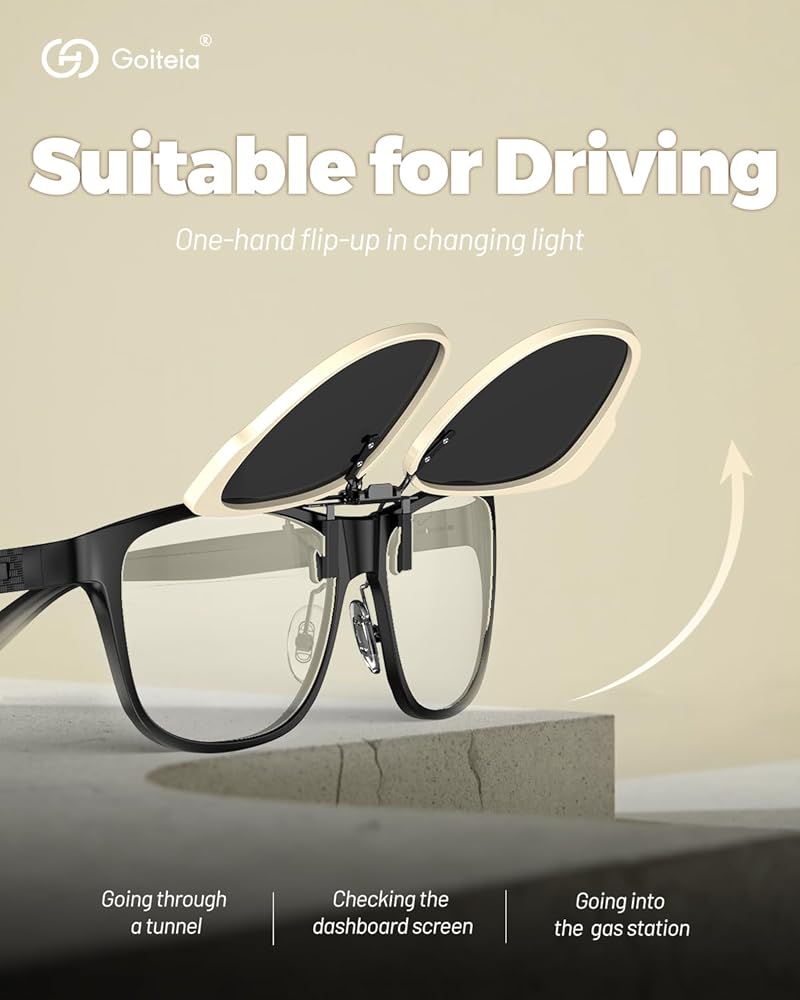 Effortless One-Handed Flip-Up Convenience: Adapt to changing light conditions in 1 second! The flip-up design of sunglasses over prescription glasses allows you to easily lift the lenses with one hand when entering darker areas, like tunnels or stores, providing instant clear vision. Perfect for navigating changing light