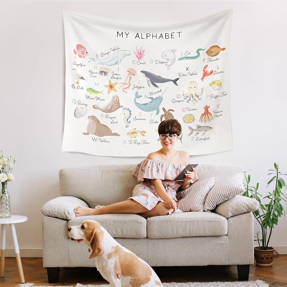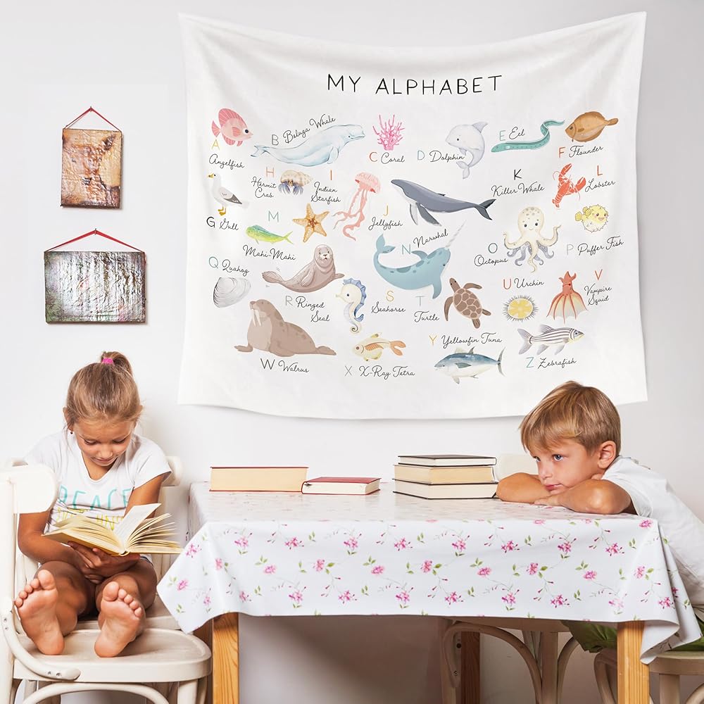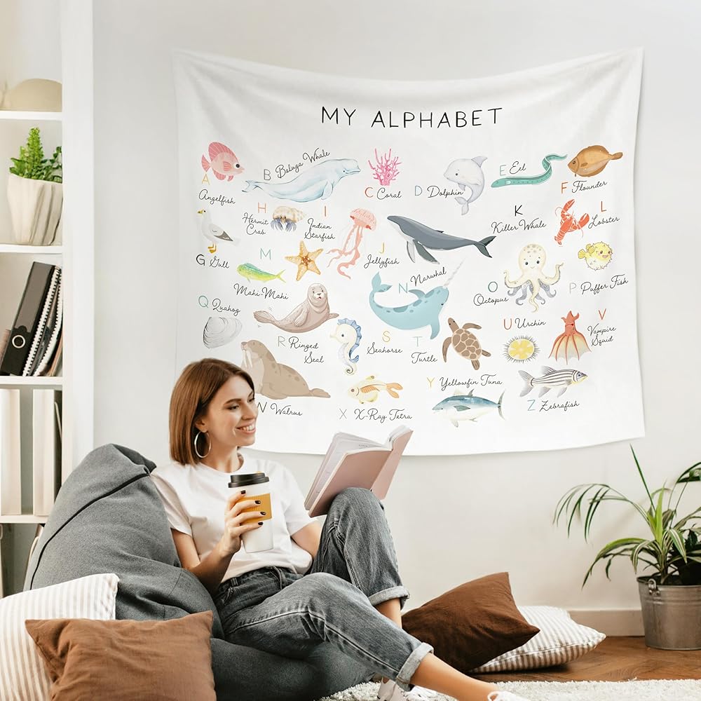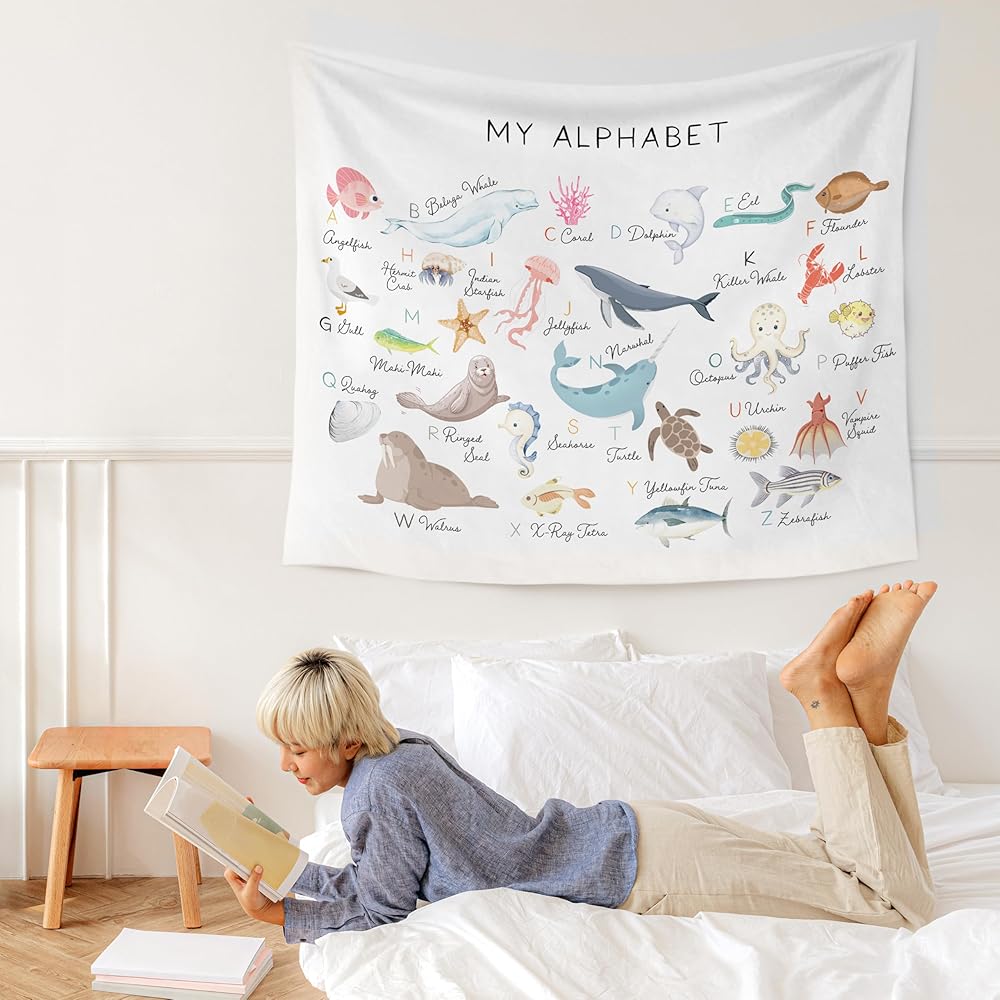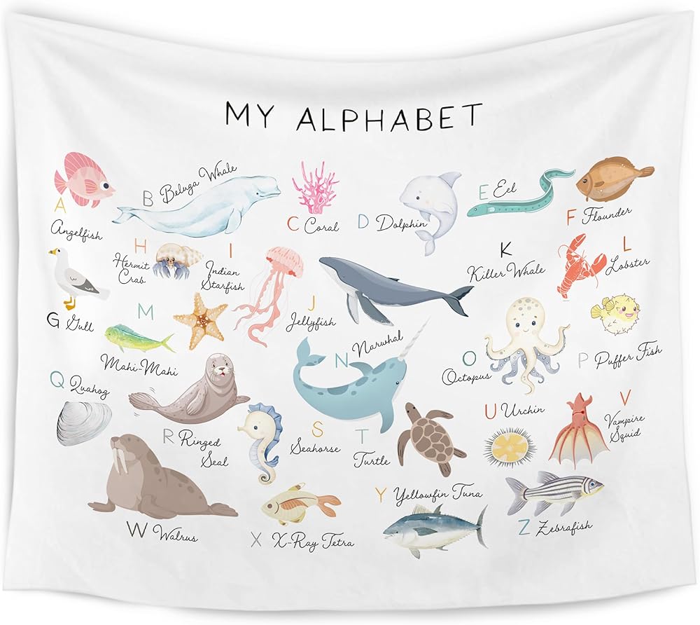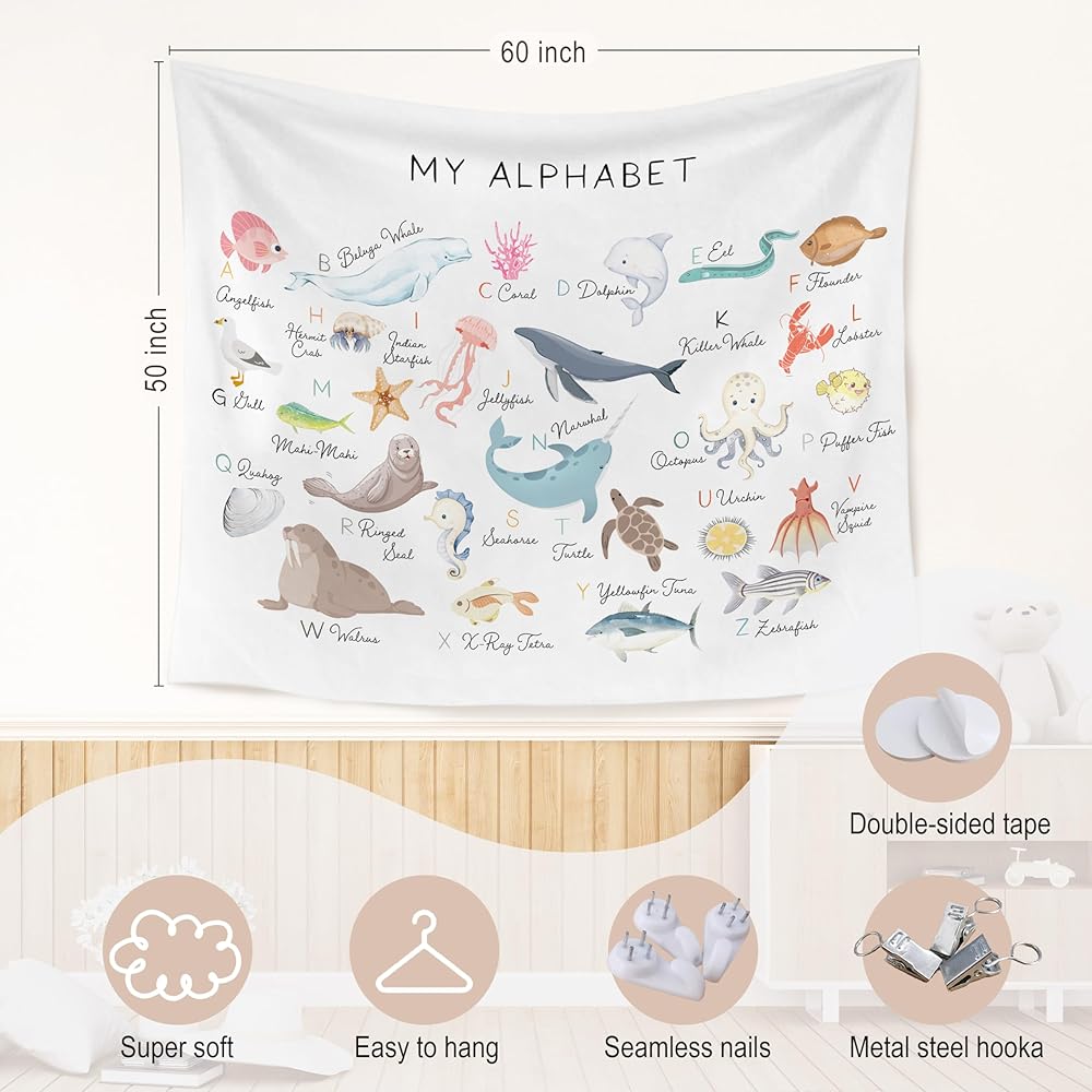 WARDOS Ocean Nursery Alphabet Tapestry, Sea Animals Kids Tapestry Wall Hanging, ABC Alphabet Educational Wall Blanket Decor for Classroom Toddler Kids Nursery Bedroom Playroom, 50x60 Inch