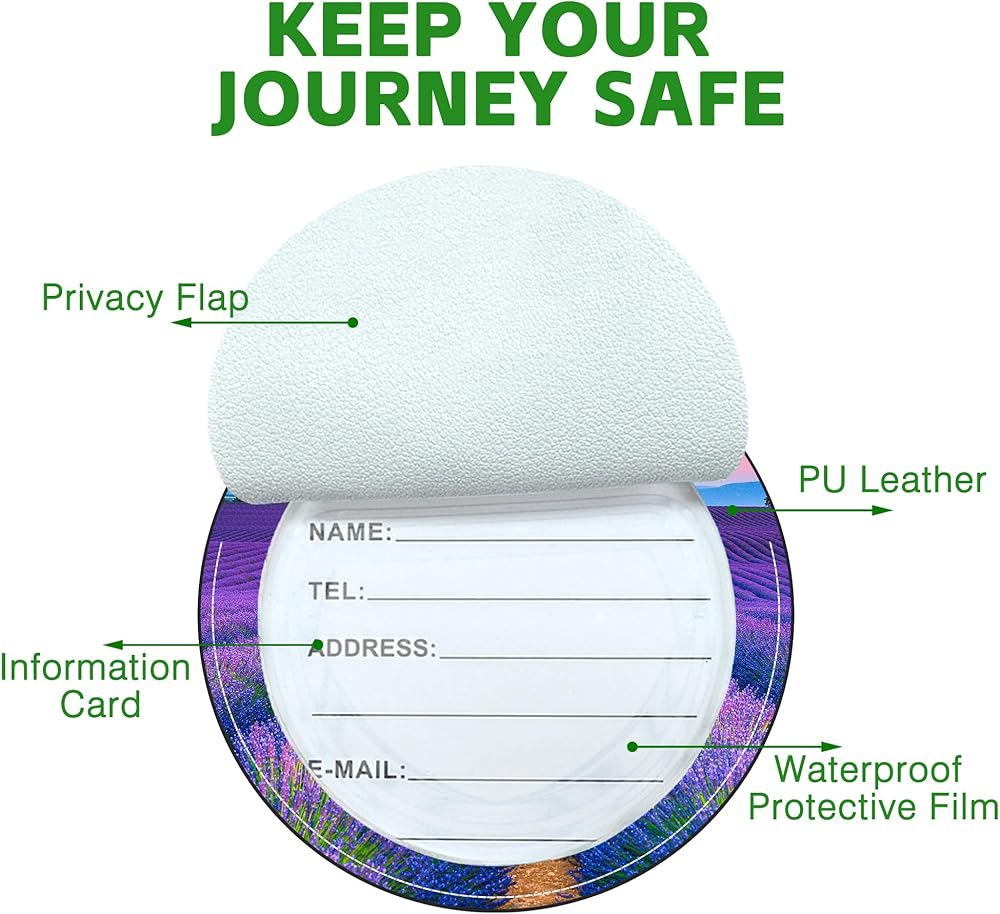 Privacy Protection:The round baggage tag is equipped with a privacy flap to protect personal privacy.The bag tag has a transparent waterproof interlayer and an information card.The information card can be written with personal information to facilitate identification and finding lost luggage