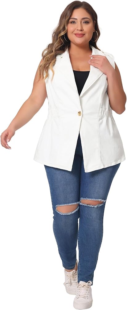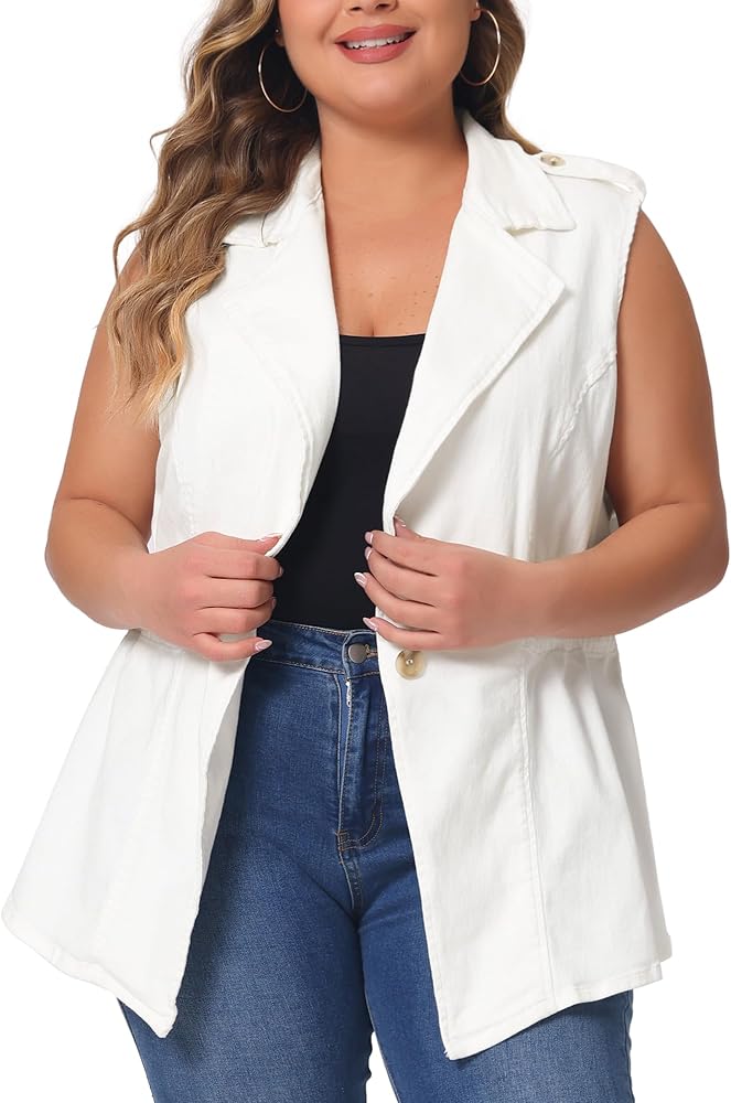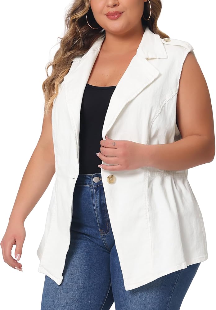Plus Size Denim Vest Jackets: Denim Vests, Sleeveless, Lapel, Button, Elastic Waist, Denim Jackets, Utility Denim Vest