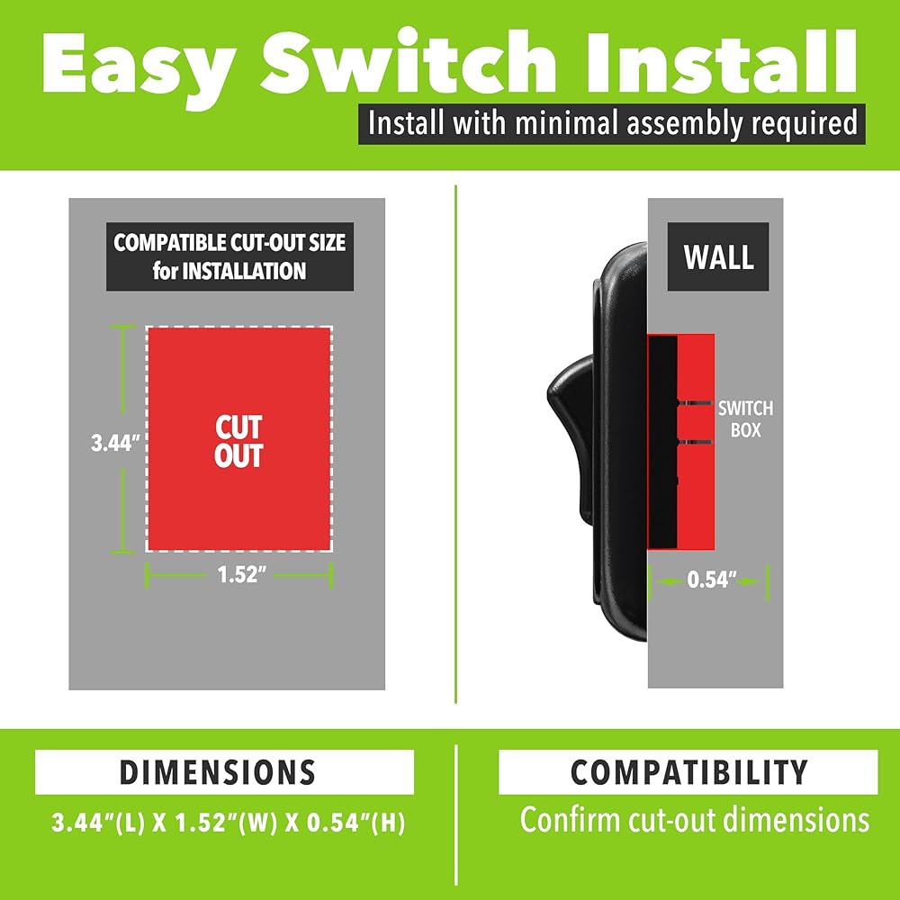 - Includes 1 switch plate and cover, mounting screws.