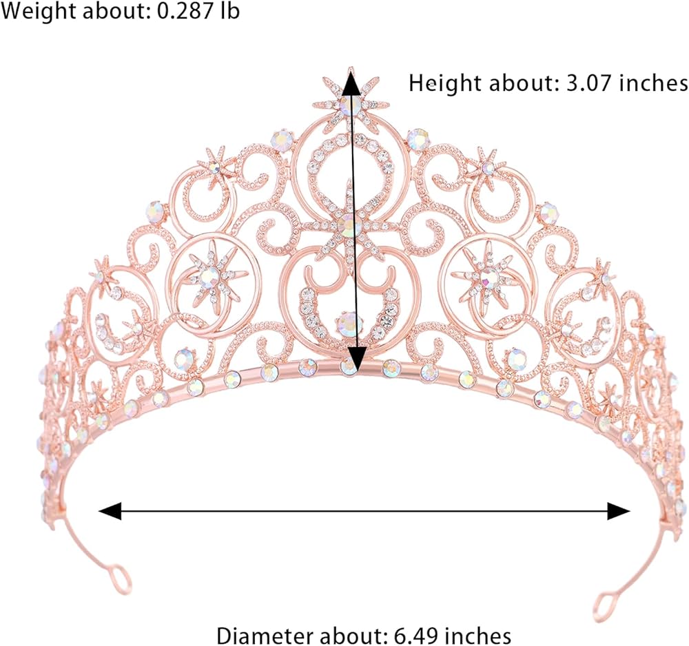 Size and Package: Our tiara crown are suitable for adult women and girls, Diameter about: 6.49 inches, Height about: 3.07 inches, Weight about: 0.287 lb. The package includes clear box and four clips to fix the crown on your head and brings you a long and comfortable wearing experience.