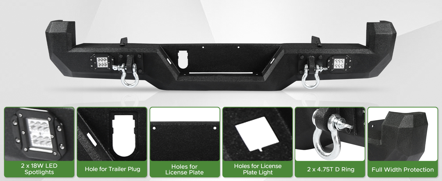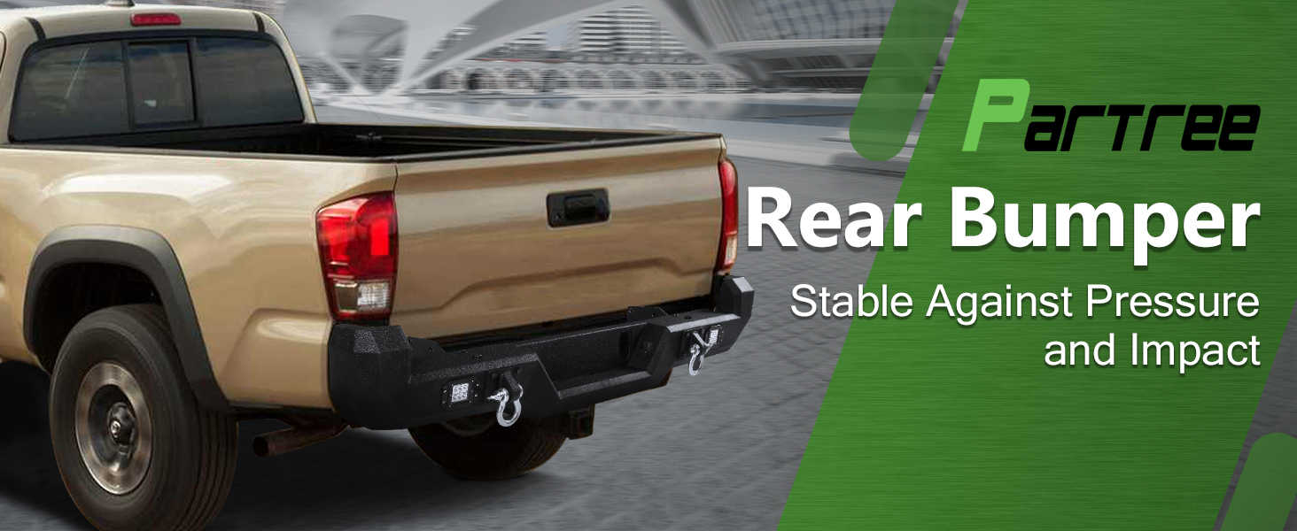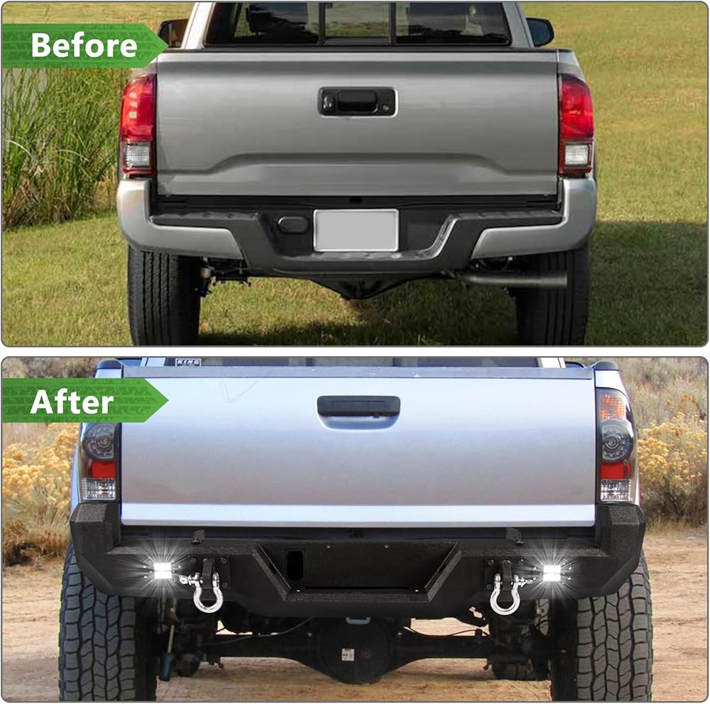 Safety and Durability: Off road rear bumper for tacoma equipped with 2 Lights for you driving safety in night. Our heavy duty rear bumper is made of Q235 carbon steel and two-stage textured black powder coating for durability