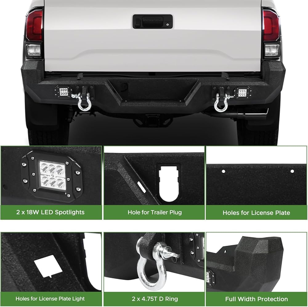 Fitment: The off road rear Bumper Fit for Toyota Tacoma 2016 2017 2018 2019 2020 2021 2022 2023. Steel bumper for 3rd Gen Tacoma equipped with 2 Lights, 2 D-Rings. Please confirm your vehicle information whether fit or not