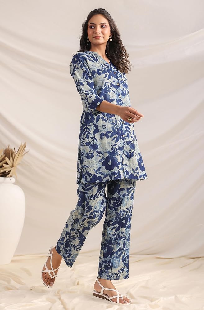 [Features] Summer Co-ord Sets for Women, Notch Neck with Mandarin Collar, quarter regular sleeves, Cotton Co-ord Set, Indigo Color, Floral Pattern, Regular fit, Tunic and straight pant set.
