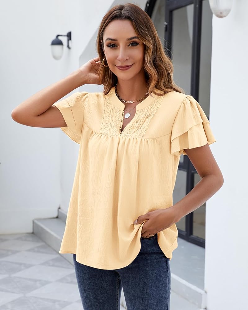 Features: This women tops feature with split v neck, ruffle short sleeve, solid color, front pleated, breathable, loose fit, fashion dressy casual blouse, pull on closure. The accent lace design adds an elegant touch to your outfit.