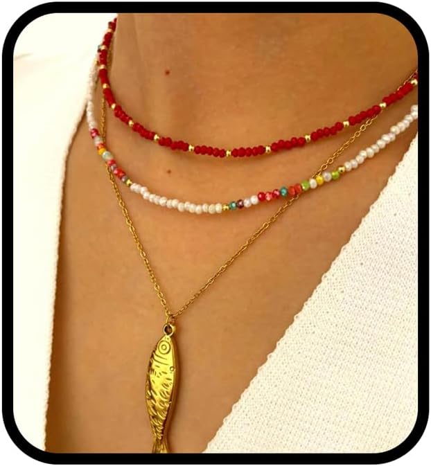 • 【Layered Necklace & Fish Necklace】: This Fish Necklace Set features a stunning gold-plated stainless steel fish pendant, complemented by two vibrant beaded necklaces—one in a bold red and the other in a white multi-colored mix. The layered design adds a chic Y2K aesthetic, perfect for fashion-forward individuals who love to express themselves