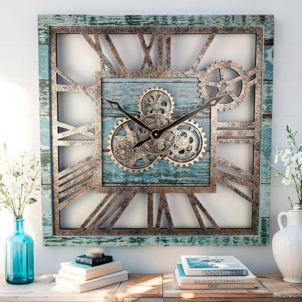 The Gears Clock 24'' Square Real Moving Gear Clock is a piece of art on your wall. MOVING GEAR | the Movement of the Gear makes the clock a living element in the environment in which it is placed. Great Decor in any room. QUALITY | Made using high-grade materials to ensure the clock's durability, the wood edge is left unmolded to leave a vintage aspect. PERFECT FOR ALL ROOMS | Improving life industrial vintage real gear clock is the perfect clock to dress up a wall in your kitchen, living room, bedroom, bathroom, family room, den, office...anywhere! Requires three AA battery, and is easily hung on any wall. The clock is 24-inches (60cm)