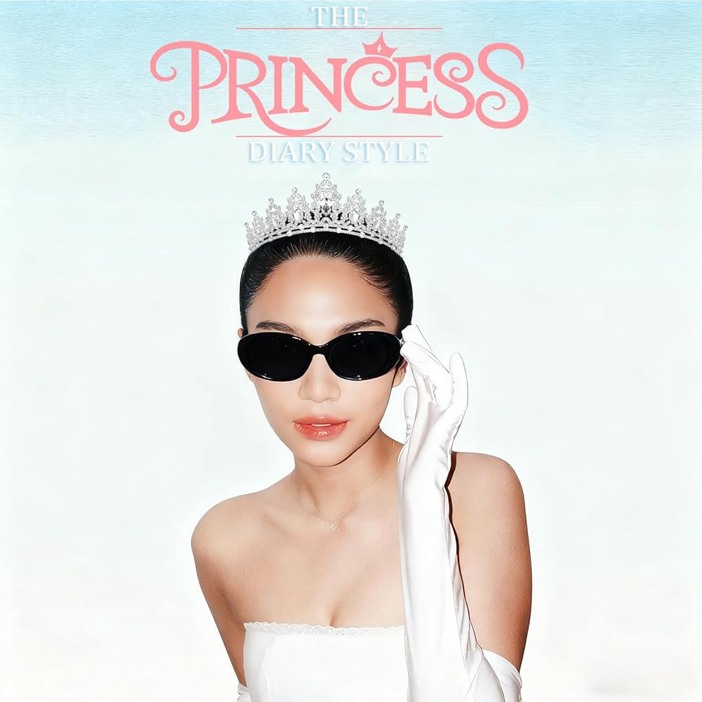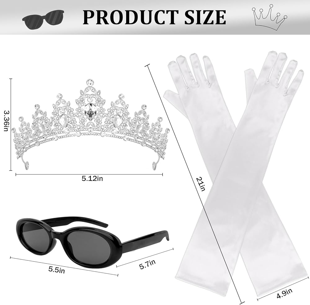 Package includes: 1 silver princess crown, 1 pair of long white gloves, 1 pair of oval sunglasses, and 1 wired headphone. Inspired by iconic movie makeover scenes, these princess accessories for women help you channel your inner princess.