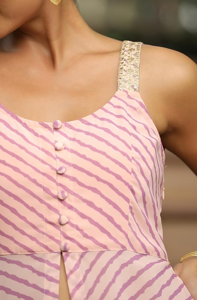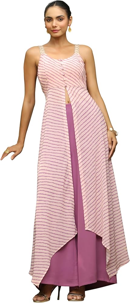 Upgrade your festive wardrobe with this peach and lavender georgette embellished co-ord set, crafted for a chic and elegant look. The peach top showcases delicate button ornamentation and sequin embellishment on the sleeve straps, adding a touch of glamour. Its attached flare creates a stylish asymmetric silhouette, perfectly complemented by the round neckline and striped lavender print for a flattering fit. Paired with lavender palazzos, semi-elasticated for comfort and featuring a side pocket, this ensemble is lined with soft butter crepe for a luxurious feel. Ideal for festive occasions, this set blends modern elegance with timeless charm.