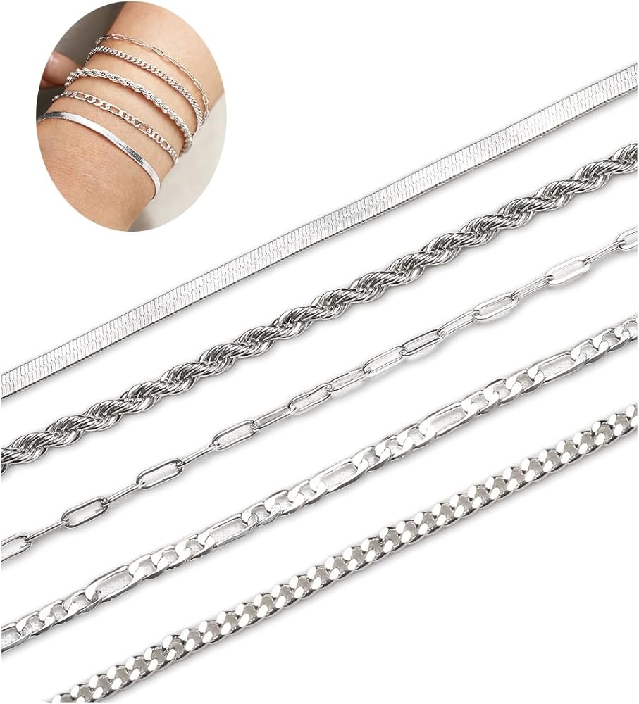 5 Pcs Stackable Bracelets Set for Women: This chain bracelet set includes five distinct chain designs: paperclip, herringbone, figaro, cuban, and twist; Perfect for creating a stylish gold bracelet stack or silver bracelet stack; Ideal for women's jewelry collections, this jewelry set for women offers versatile stackable bracelets to mix and match with your favorite dainty gold bracelets or bead bracelets