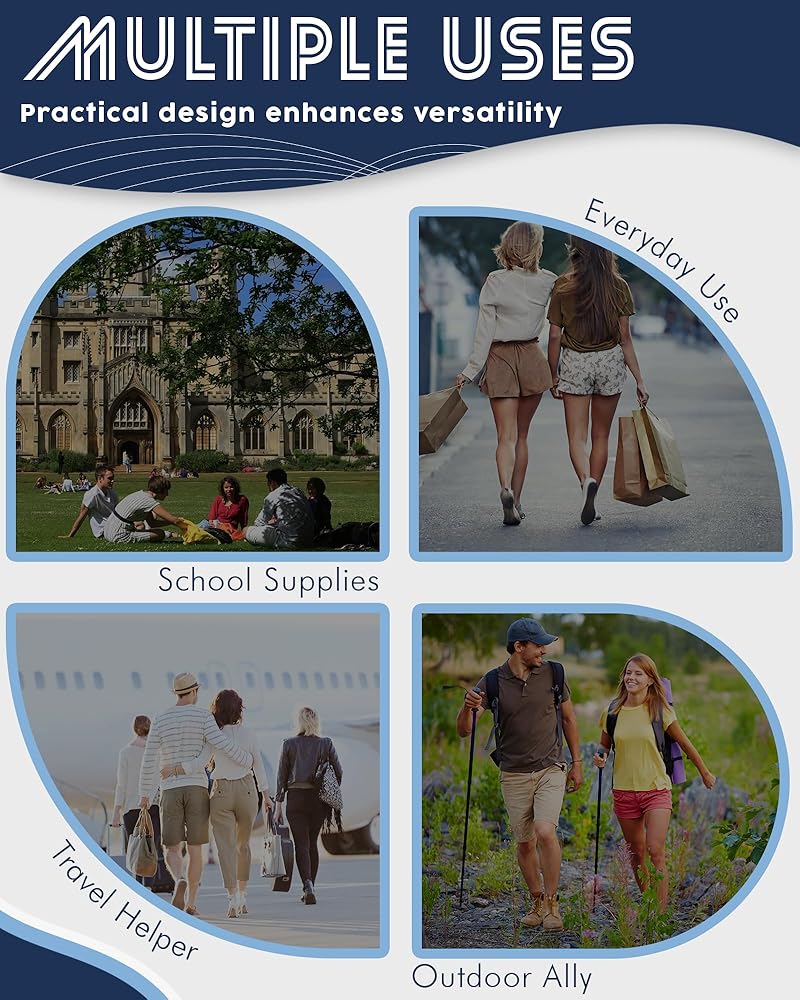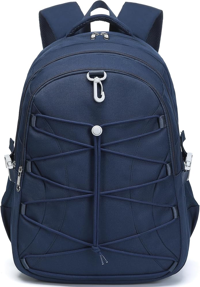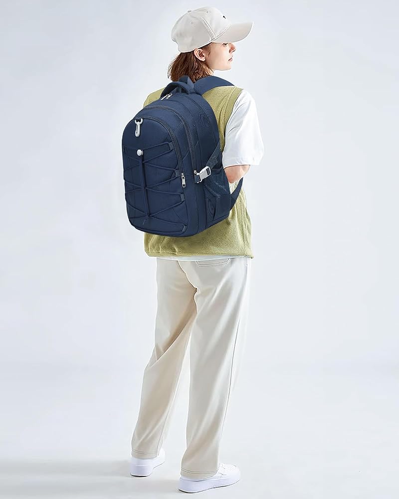 This bag has 3 main compartments, designed with a laptop and tablet sleeve, a zippered pocket, and 2 slots for organization. It also has 2 side pockets with securing straps to keep water bottles and umbrellas in place. The front bungee cord and clasp hook, along with the 2 D-rings on the back, make it easy to hang clothes, caps, keys, glasses, and more. The ergonomic S-shaped straps and chest strap are adjustable, helping distribute the weight evenly, carrying it is a breeze.