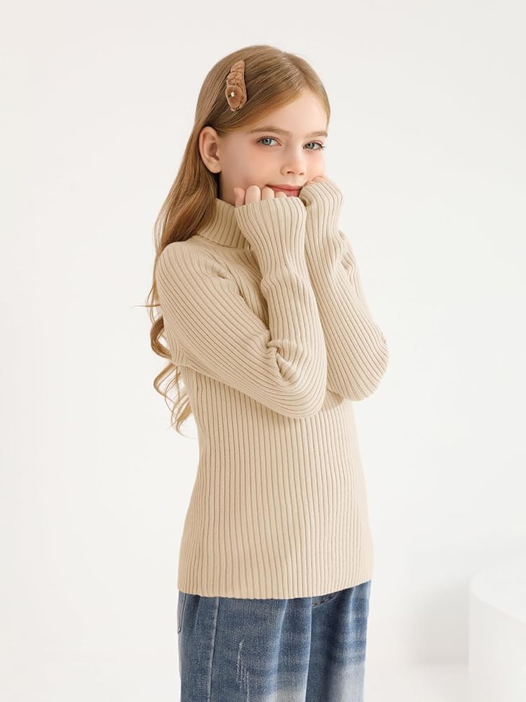 Features: Long sleeve high neck pullover tops for girls, elastic, solid color, regular length. A warm and cute lazy sweater for kid girls aged 5-14.