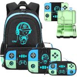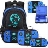 Bevalsa Backpack for Boys with Bento Lunch Box Set, Cool Luminous Gamer Boys Backpack Bookbag for Kid, 43oz Lunch Containers Lunchbox, Insulated Lunch Bag & Pencial Case, Back To School Gift (Blue)