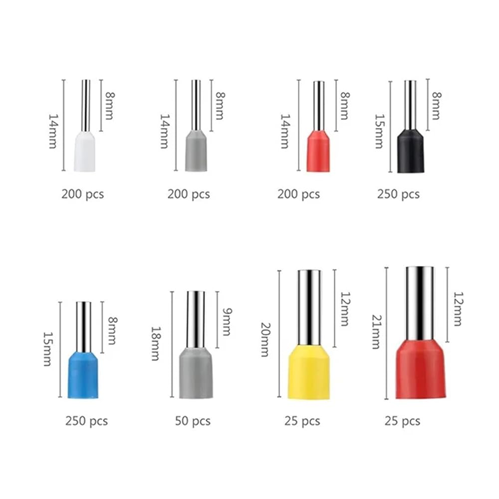 ECM WiringSpecification:Quantity: 400 PCSMaterial: tinned copper + plasticDimensions are as follows:400 pieces:(AWG/mm2;/type/quantity)22 AWG /0.5mm2;/E0506/100 pieces22 AWG /0.5mm2;/E0508/100 pieces20 AWG /0.75mm2;/E7508/50 pieces18 AWG /1.00mm2;/E1008/50 pcs16 AWG /1.50mm2;/E1510/25 pieces14 AWG /2.50mm2;/E2512/25 pieces12 AWG /4.00mm2;/E4012/25 pieces10 AWG/6.00mm2;/E6012/25 pieces