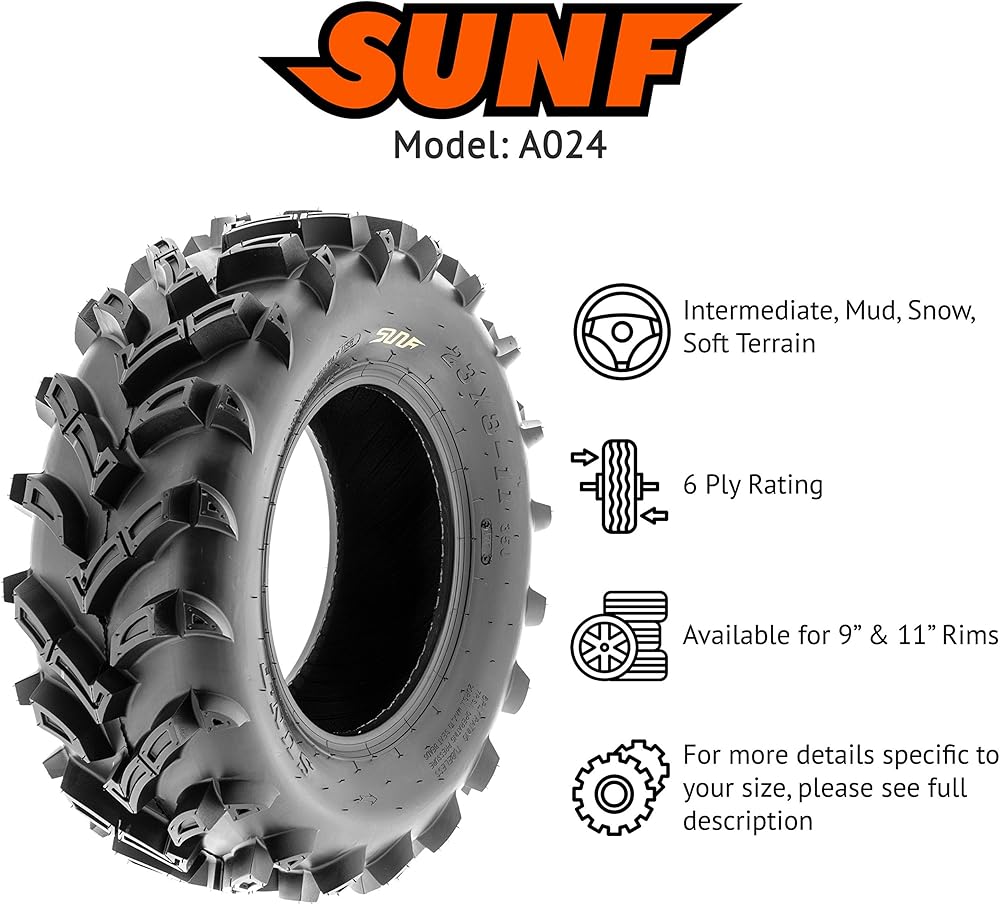 SunF Corporation has dedicated themselves to meeting their customer's demands and needs. SunF develops and manufactures a wide variety of quality tires in the specialty market. Their line up includes ST trailer, lawn and garden, agriculture, golf cart, ATV Quad Motorcycle, UTV Side by Side, light truck & more!The SUNF A024 ATV tire features a specialized directional "V angled" tread pattern, optimized for exceptional all-terrain performance, providing reliable traction and stability.All-Terrain Excellence: Engineered to excel across various terrains, including mud, sand, and rocky surfaces, the A024 tire offers consistent and dependable performance for off-road enthusiasts seeking versatile traction.Durable 6 Ply Construction: Crafted with a robust 6-ply construction, the A024 tire is designed for durability, effectively resisting punctures, cuts, and impacts to tackle rugged off-road conditions with confidence.Shoulder Traction Innovation: Equipped with advanced shoulder traction technology, the A024 tire ensures superior grip during turns and challenging maneuvers on diverse terrains, enhancing off-road control.Wide Size Range: Available in sizes ranging from 22 to 25 inches, the SUNF A024 tire accommodates a variety of ATV models and rider preferences, ensuring a customized fit for various vehicle setups and requirements.Size 1: 22x11-9